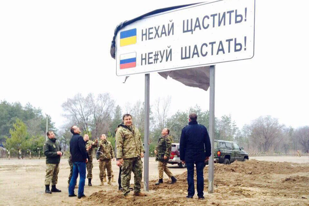 В 2016 году Михаил Саакашвили, в ту пору глава Одесской областной госадминистрации, получивший из рук президента Петра Порошенко украинское гражданство, приехал в Луганскую область, в город с названием Счастье. Привез бойцам АТО подарки от волонтеров. И под одобрительный хохот установил дорожный знак, содержание которого восходило к анекдоту с бородой: «На Киевском вокзале звучит объявление: «Громадяни пасажири, що прямують до Одеси, нехай щастить! (»Граждане пассажиры, которые следуют в Одессу, будьте счастливы!« — Прим. ред.). Граждане пассажиры, едущие в Москву, — нех… шастать!»».