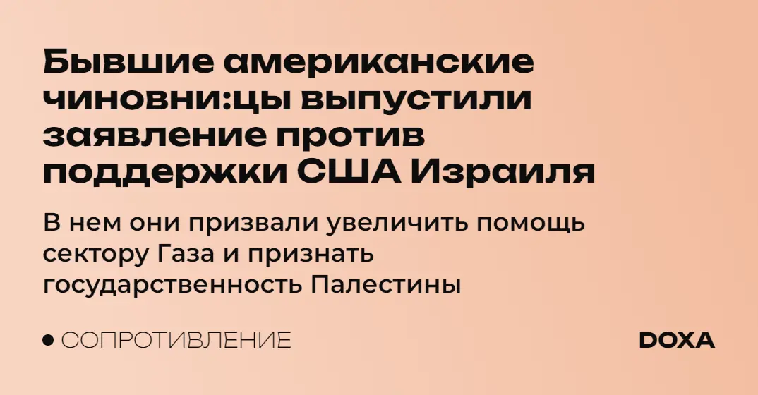 Бывшие американские чиновни:цы выпустили совместное заявление против поддержки США войны в секторе Газа. Ранее эти госслужащие ушли в отставку в знак протеста из-за американской политики по отношению к Израилю.
