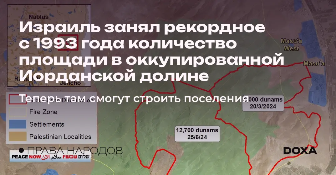 Израиль экспроприировал почти три тысячи акров земли в Иорданской долине, которая находится на оккупированном Западном берегу одноименной реки. Эта цифра стала рекордной с 1993 года, когда Израиль и Организация освобождения Палестины подписали договор в Осло.
