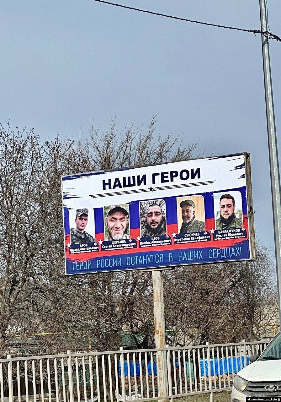 Баннер с фотографиями погибших в Украине российских военных, среди которых есть портрет Азрет-Али Суюнчева, как выяснила редакция Кавказ.Реалии, был установлен в феврале этого года в городе Усть-Джегуте. В сообщении местного отделения фонда "Защитники Отечества" говорится, что инициатором установки выступил глава Усть-Джегутинского муниципального района Мурат Лайпанов, член партии "Единая Россия".