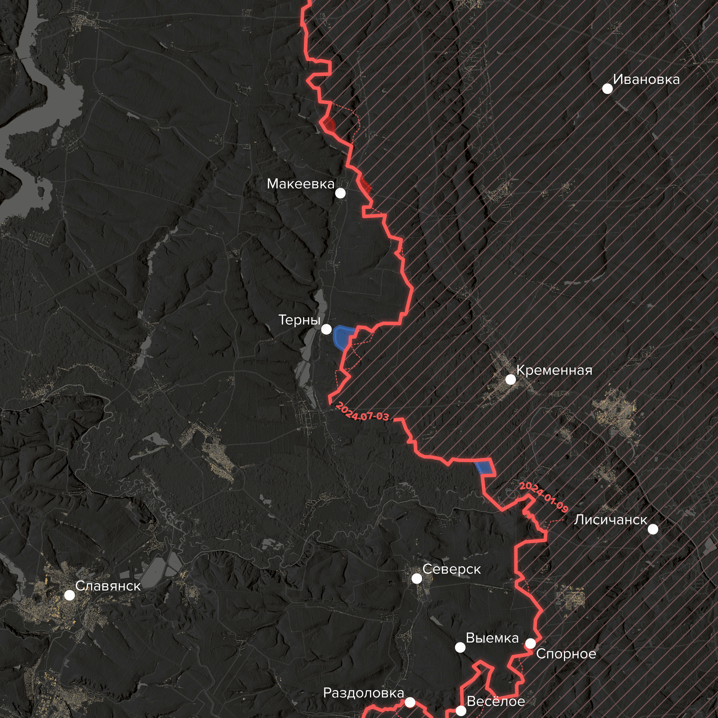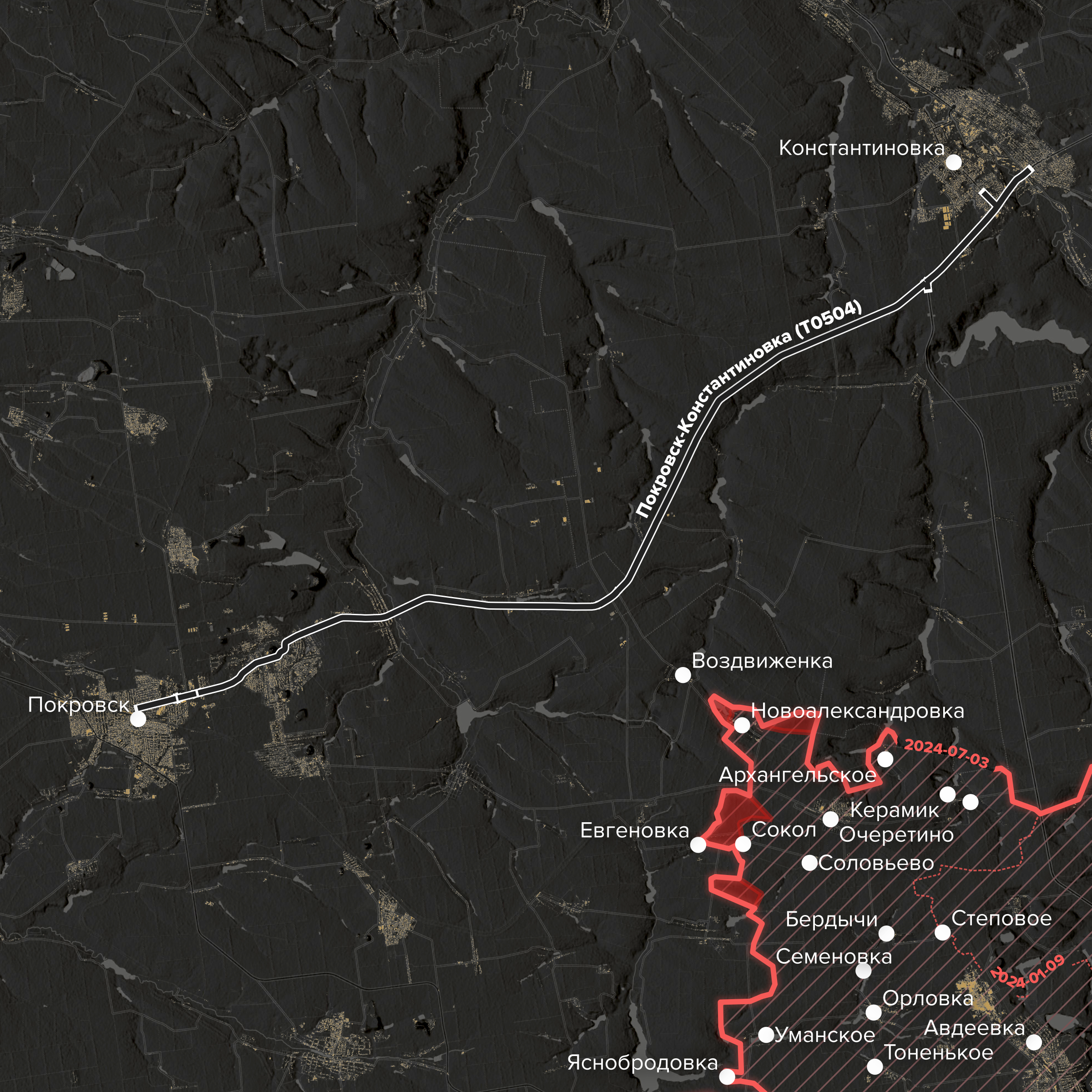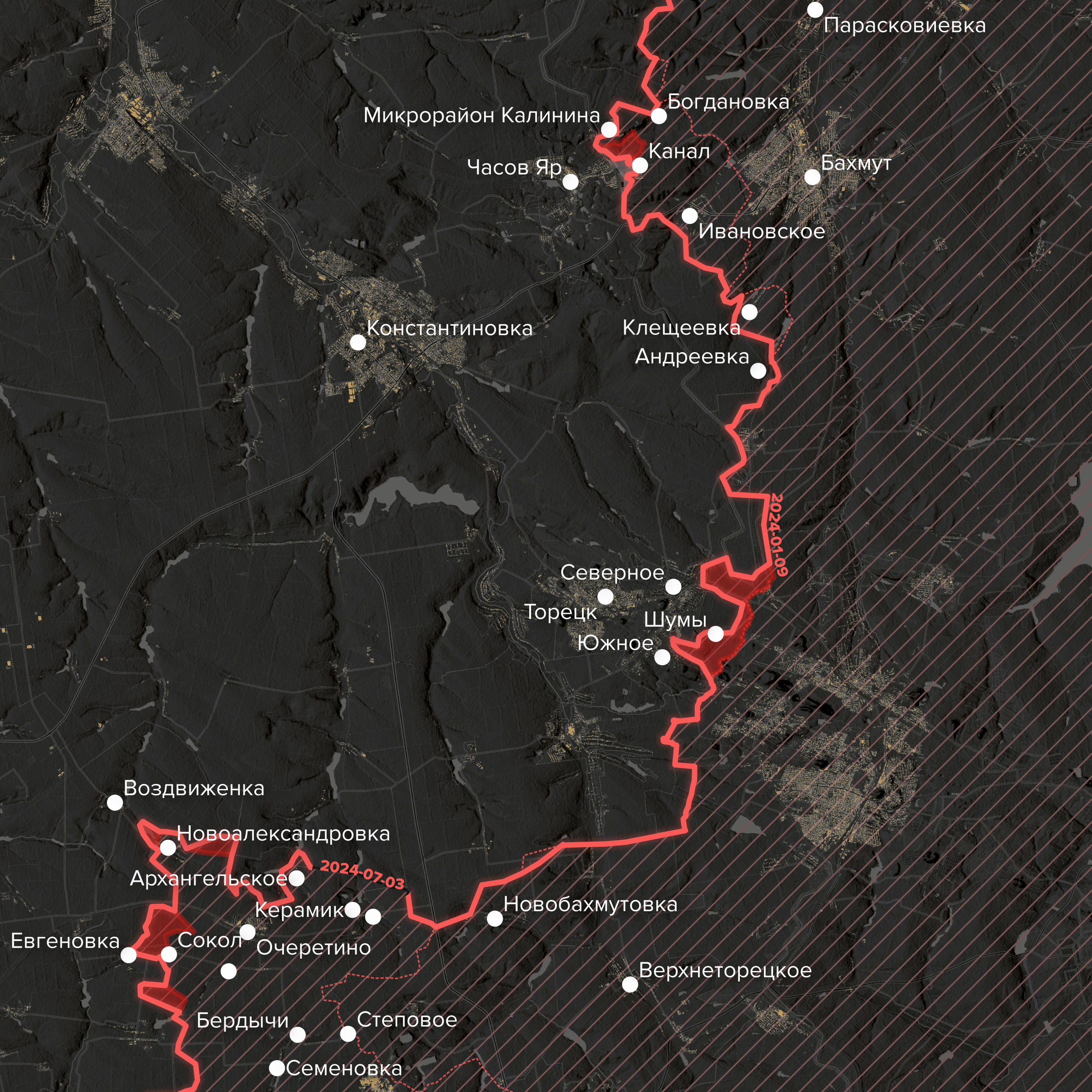 - Юго-восточнее Торецка — в поселке Южное (бывшее Артемово), — как утверждают украинские источники, российские войска также продвинулись на несколько километров вглубь украинской обороны. Кроме того, началось наступление и на поселок Нью-Йорк к северо-западу от города. Видеоподтверждений этим прорывам пока не поступало.