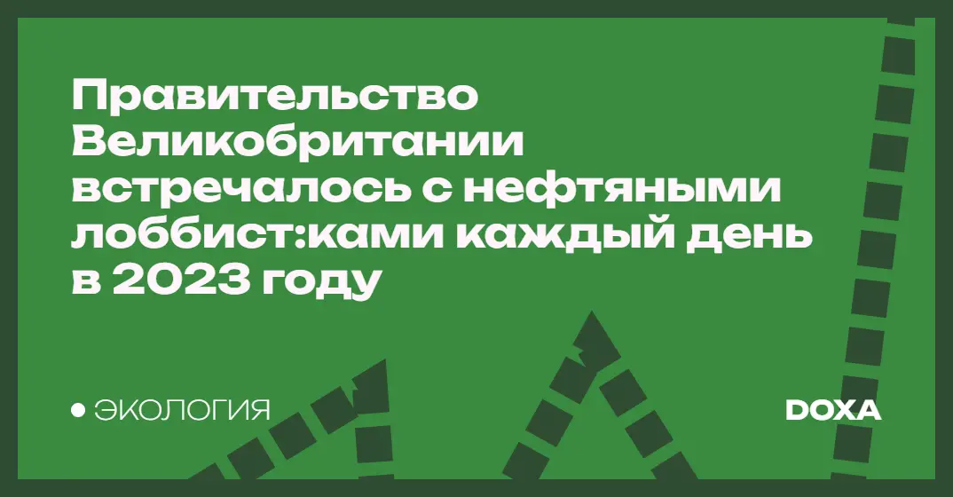 Расследование организации Global Witness показало, что чиновни:цы правительства Великобритании встречались с лоббист:ками нефтегазовой отрасли в среднем 1,4 раза в рабочий день в 2023 году. Всего таких встреч зафиксировано не менее 343 за 2023 год. Общее количество встреч растет с 2012 года — момента, когда Transparency International UK начала отслеживать их.