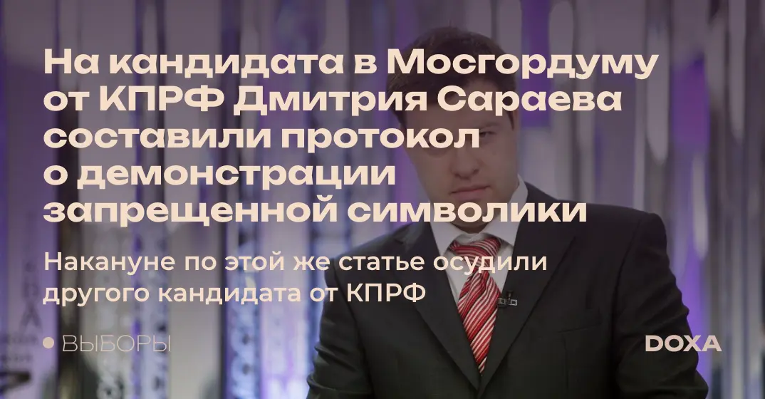 Утром силовики задержали кандидата в депутат:ки Мосгордумы от КПРФ Дмитрия Сараева. Его доставили в отдел полиции, где составили протокол по статьеСтатья 20.3 Административного кодекста (Пропаганда либо публичное демонстрирование нацистской атрибутики или символики, либо атрибутики или символики экстремистских организаций, либо иных атрибутики или символики, пропаганда либо публичное демонстрирование которых запрещены федеральными законами запрещенной символики) о пропаганде или демонстрации нацистской, экстремистской или другой запрещенной символики. Согласно Федеральному закону об избирательных правах осужденные по этой статье теряют право избираться.