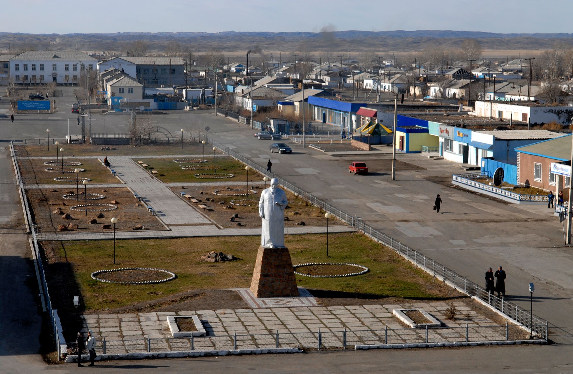 John van Hasselt / Corbis / Getty Images Karaul’s village square and the monument to Kazakhstan’s literary hero, Abay