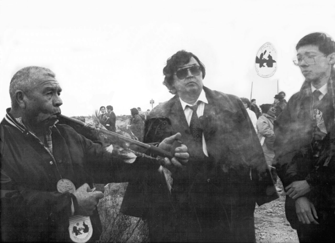 Linda Putnam / Pelican Pond Publishing Western Shoshone elder and antinuclear activist Corbin Harney (left) and Olzhas Suleimenov (center) sharing a peace pipe at the Nevada Test Site. January 5, 1991.