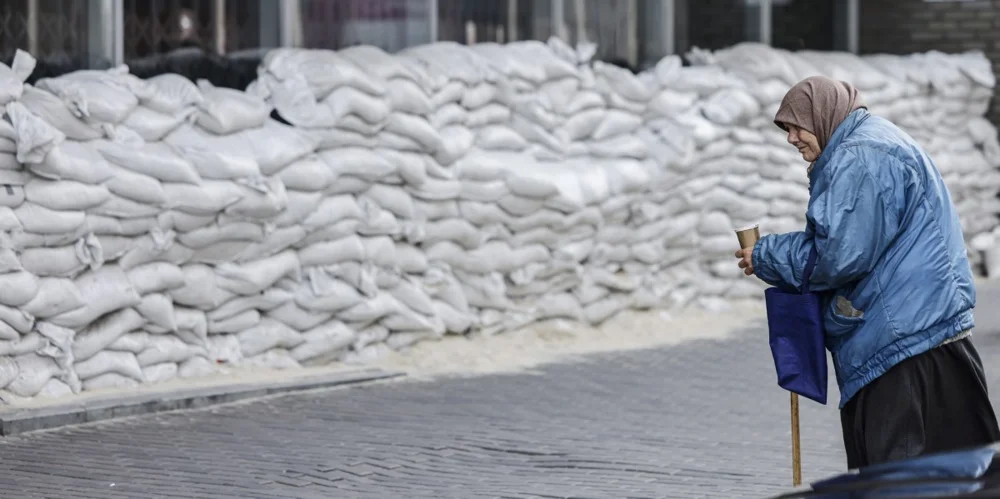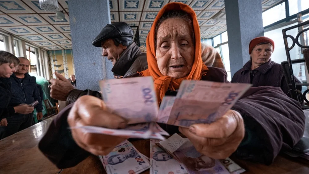 An elderly woman holds money after receiving her pension in the recently liberated city of Lyman, Donetsk region, Ukraine, 11 October 2022. Photo: EPA-EFE/YEVGEN HONCHARENKO