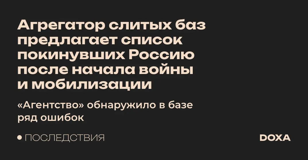 Сервис-агрегатор слитых баз предлагает список покинувших Россию после начала войны и мобилизации, выяснило «Агентство». В базе содержится ряд ошибок, а также не учитываются вернувшиеся из миграции россиян:ки.