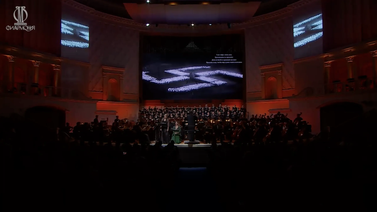 On January 27, 2024, the 80th anniversary of the lifting of the siege of Leningrad and two years after the start of the war in Ukraine, the Moscow Philharmonic choir performed Verdi’s Requiem at Tchaikovsky Concert Hall. This production was first shown in 2019, with the staging remaining characteristically unchanged ever since. Typically, large screens behind the singers display footage from the Great Patriotic War, but not on this occasion.