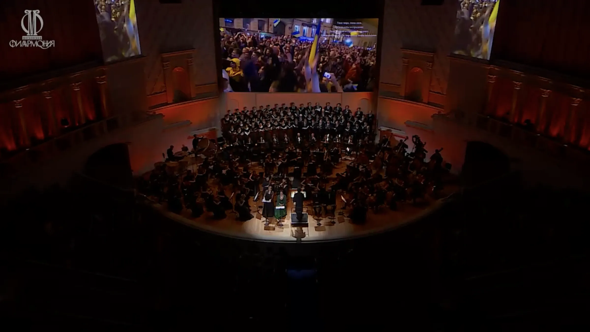 When the choir sang the final part of the Requiem — Libera Me (“Deliver me”) — the screens unexpectedly displayed a nine-minute montage where scenes of Nazi torchlight processions in Berlin were replaced by footage from the Euromaidan uprisings in Kyiv. A burning swastika transformed into yellow and blue flags, and the dismantling of Soviet monuments in Ukraine, Latvia, and Estonia was accompanied by archival footage of book burnings in the Third Reich.