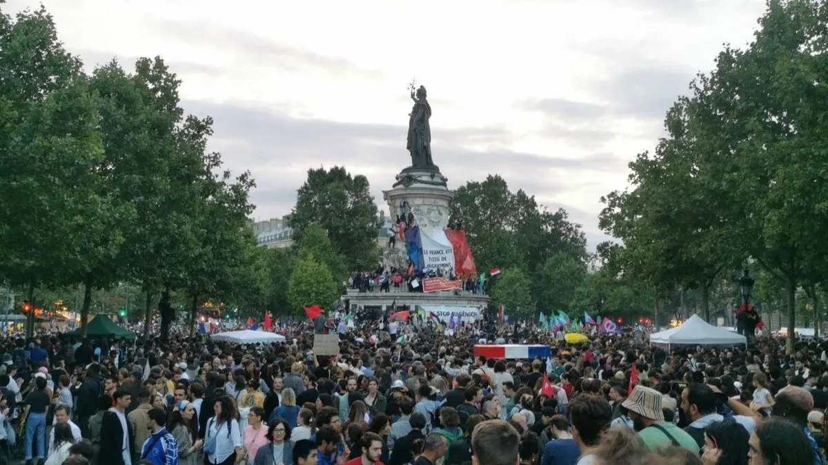 Несколько тысяч человек на площади Республики в Париже приветствуют предварительные итоги выборов. Фото: Юрий Сафронов / «Новая газета»