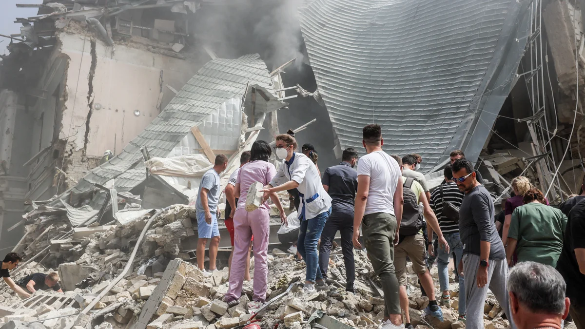 Разбор завалов у детской больницы, поврежденной в результате ракетного обстрела в Киеве, 8 июля 2024 года. Фото: Глеб Гаранич / Reuters / Scanpix / LETA