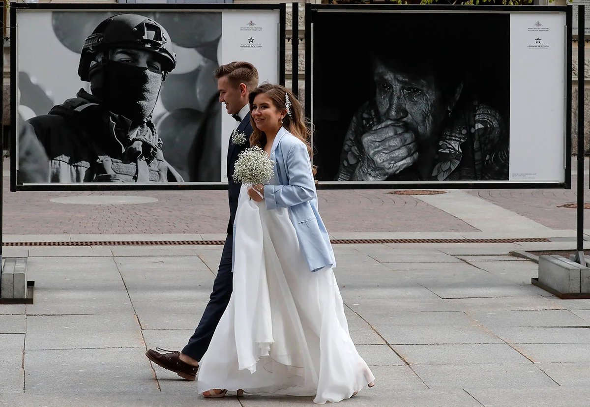 Мужчина проходит мимо инсталляции с фотографиями российских солдат во время уличной выставки под названием «Мы несем мир!» в Москве, Россия, 25 апреля 2024 года. Фото: Юрий Кочетков / EPA-EFE