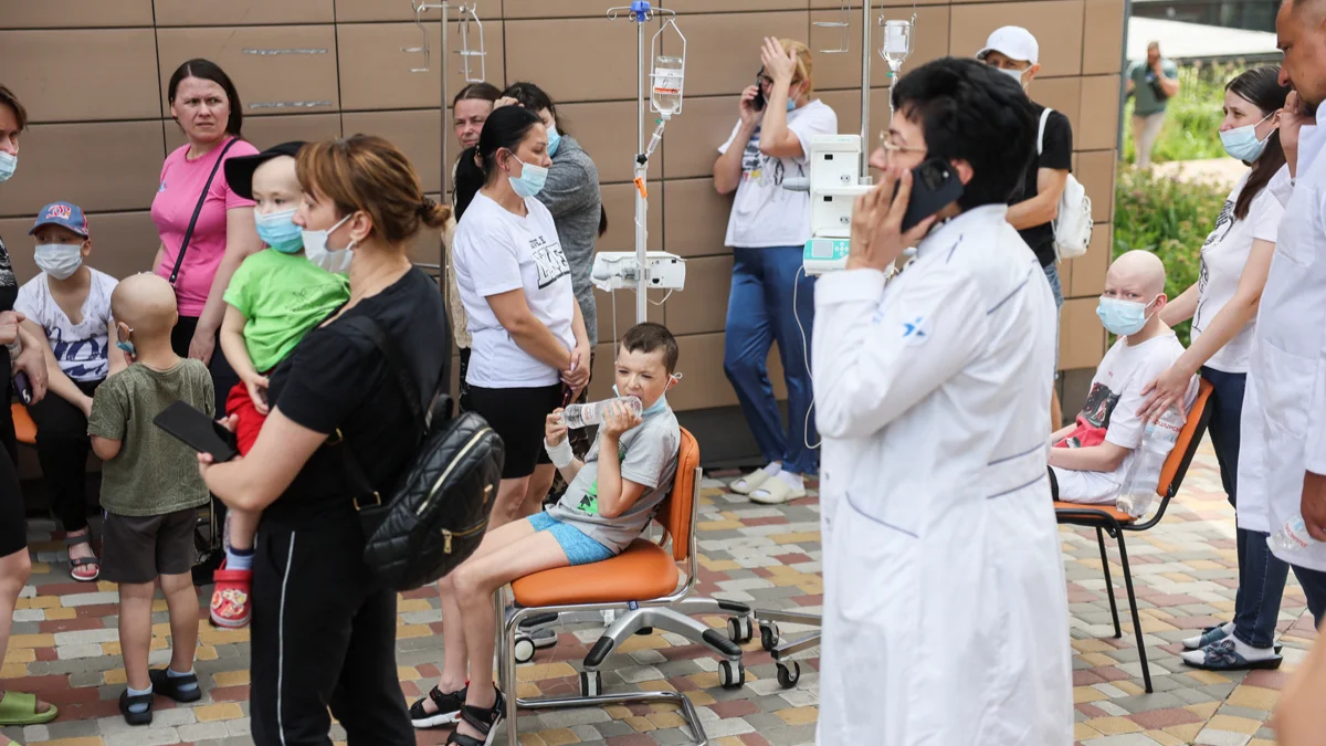 Patients of the Okhmatdyt Children’s Hospital are forced to wait outside after being evacuated following a strike on the building. Photo: Gleb Garanich / Reuters / Scanpix / LETA