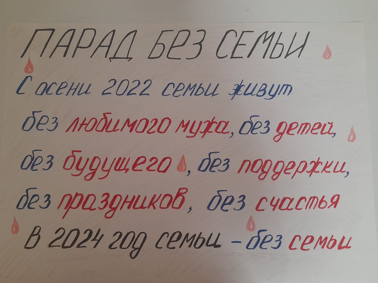 – Пускай видят, что нас много – семей, которых лишили в этот год единства. Для того мы и проводим наши акции. Люди участвуют – значит, нас видно, – рассказывает одна из организаторов акции Валерия (имя изменено по соображениям безопасности. – СР). Её мобилизованный отец находится в зоне так называемой "специальной военной операции" с октября 2022 года. Она говорит, что каждый день просыпается и засыпает с мыслями об отце: как он там, жив ли ещё, не стал ли калекой. Плачет. Пьёт антидепрессанты. И мечтает только об одном: "чтобы всё это поскорее закончилось".