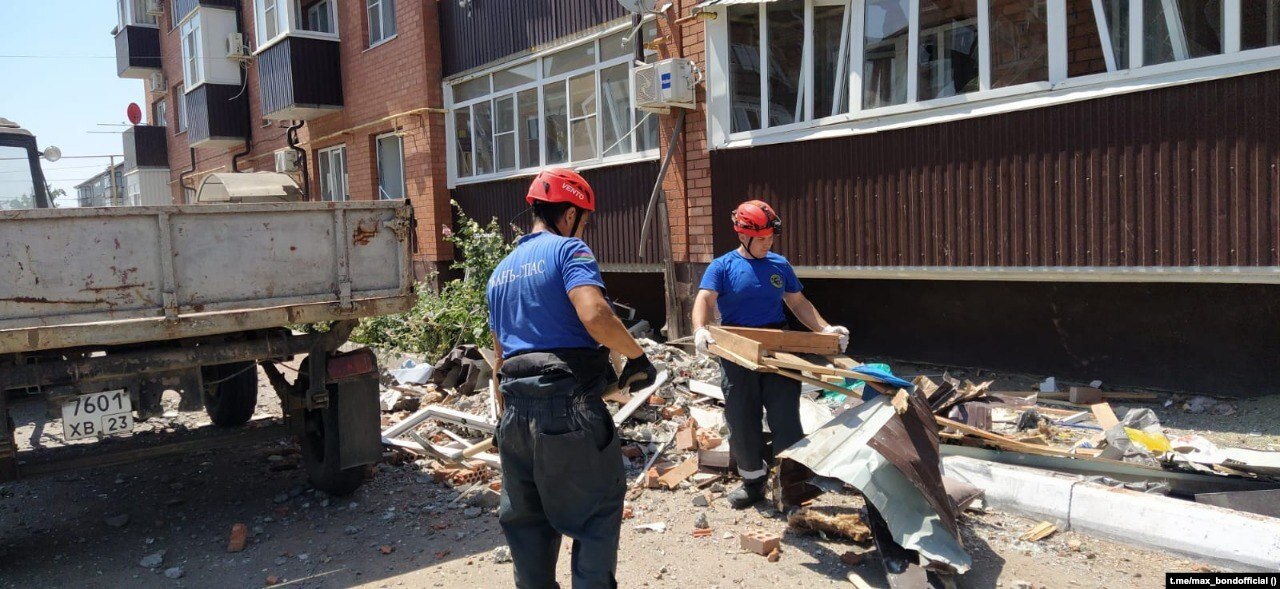На видео, опубликованном государственным телеканалом "Кубань 24", показано, что в результате предполагаемого падения обломов БПЛА повреждена крыша жилого дома, снесена кирпичная стена балкона в квартире на третьем этаже, в других квартирах выбиты стекла.