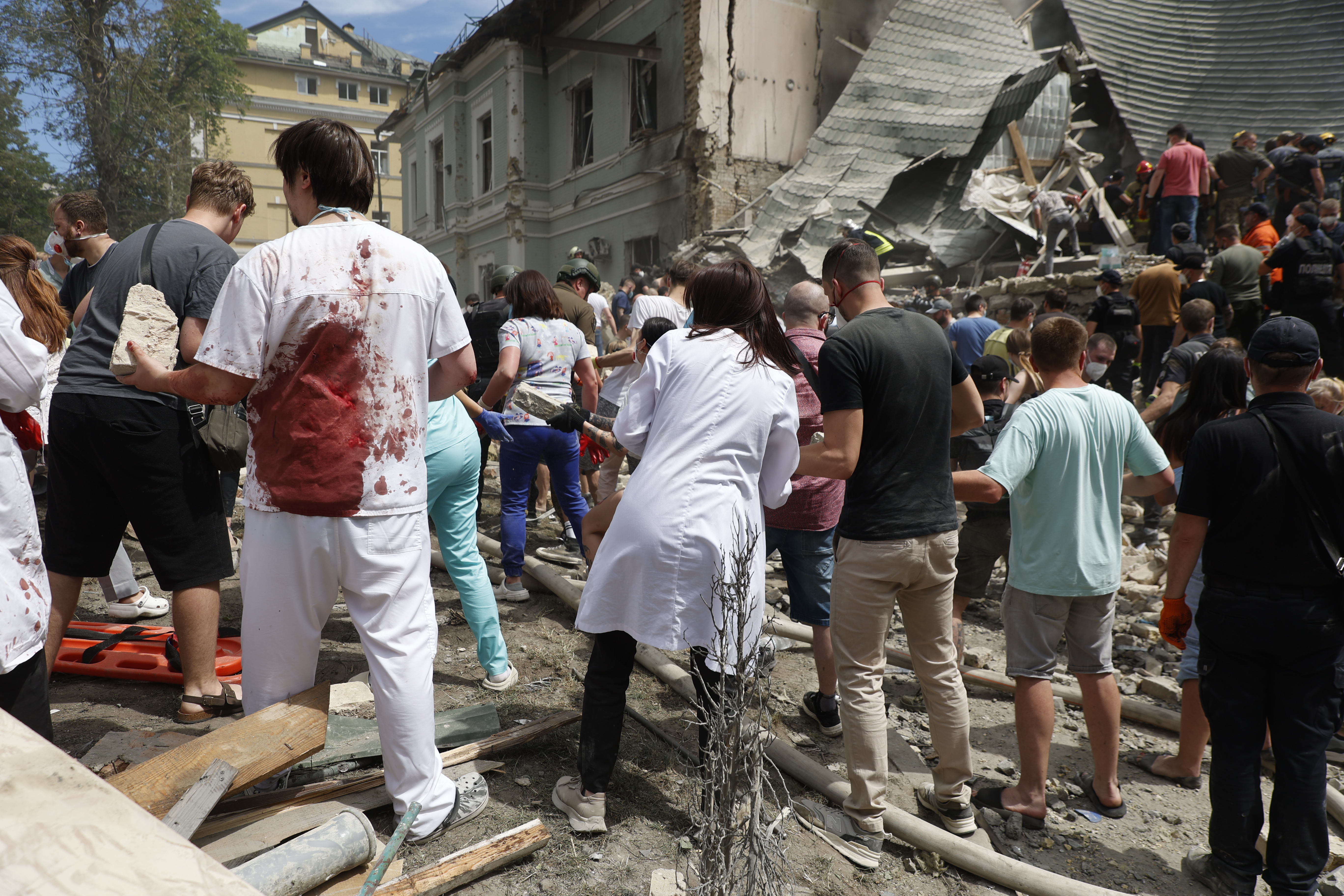 Из киевской детской больницы "Охматдет", один из корпусов которой был разрушен в результате удара и несколько корпусов пострадали, все пациенты были переведены в другие больницы. C утра во вторник поступили сообщения, что спасатели при разборе завалов добрались до подвала, где, как предполагалось, могли оставаться люди. Однако, как сообщается, под завалами никого не было.