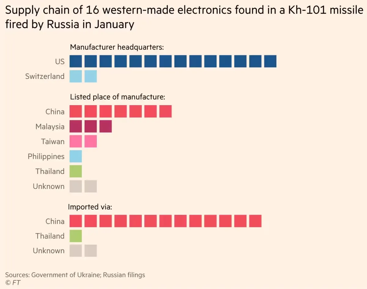 Офис президента Украины предоставил FT анализ обломков ракеты X-101, согласно которому снаряд мог включать более 50 различных деталей иностранного производства.