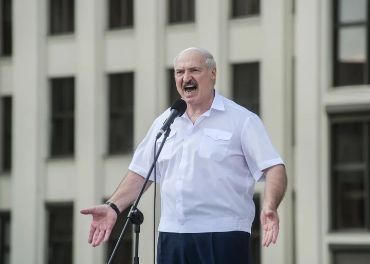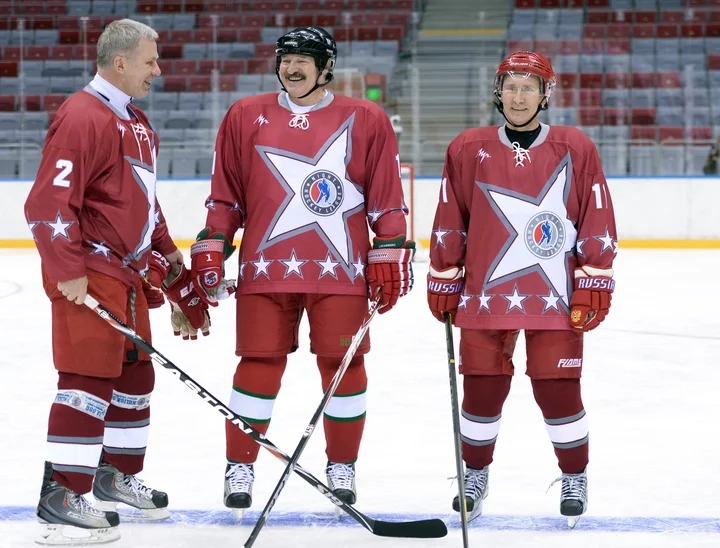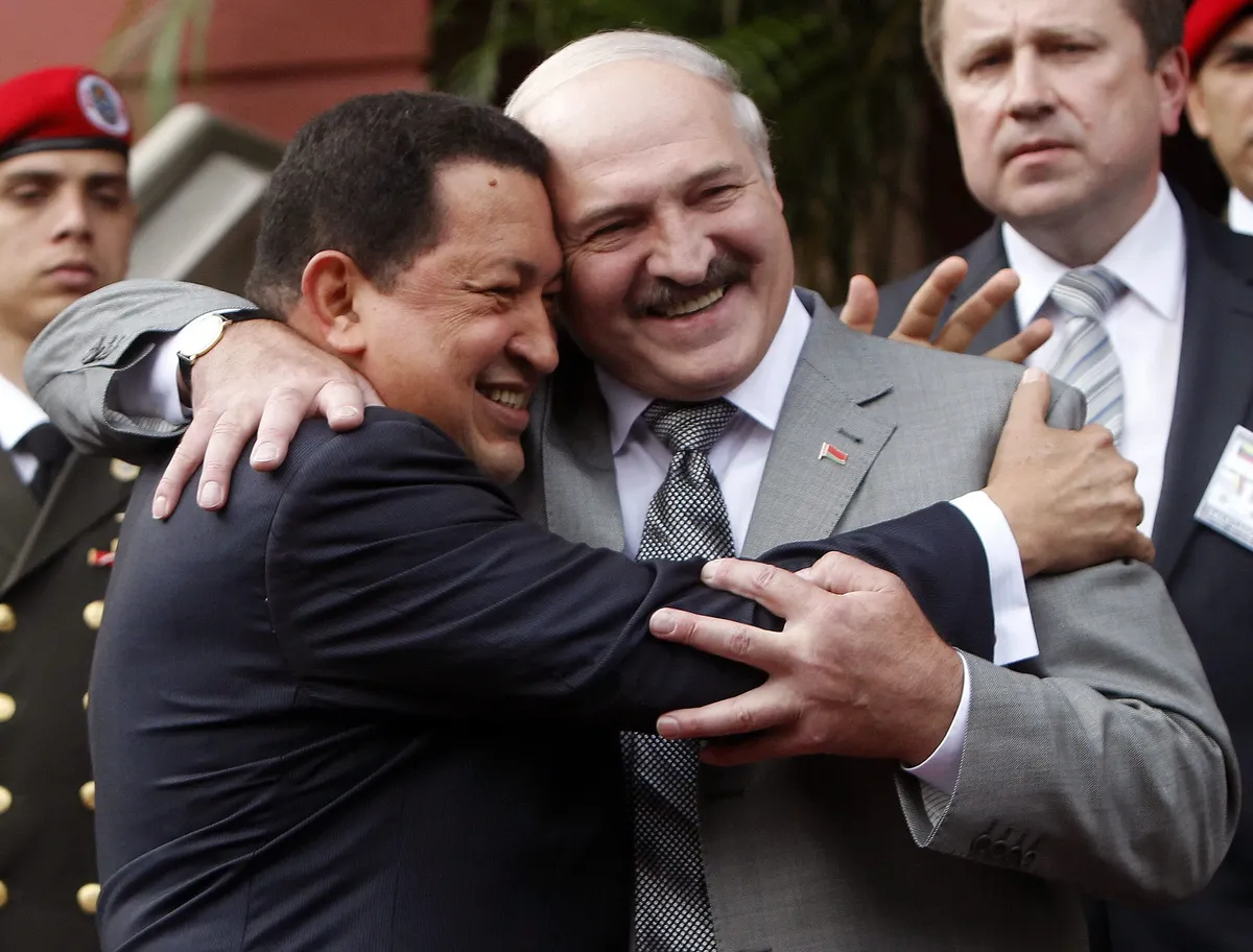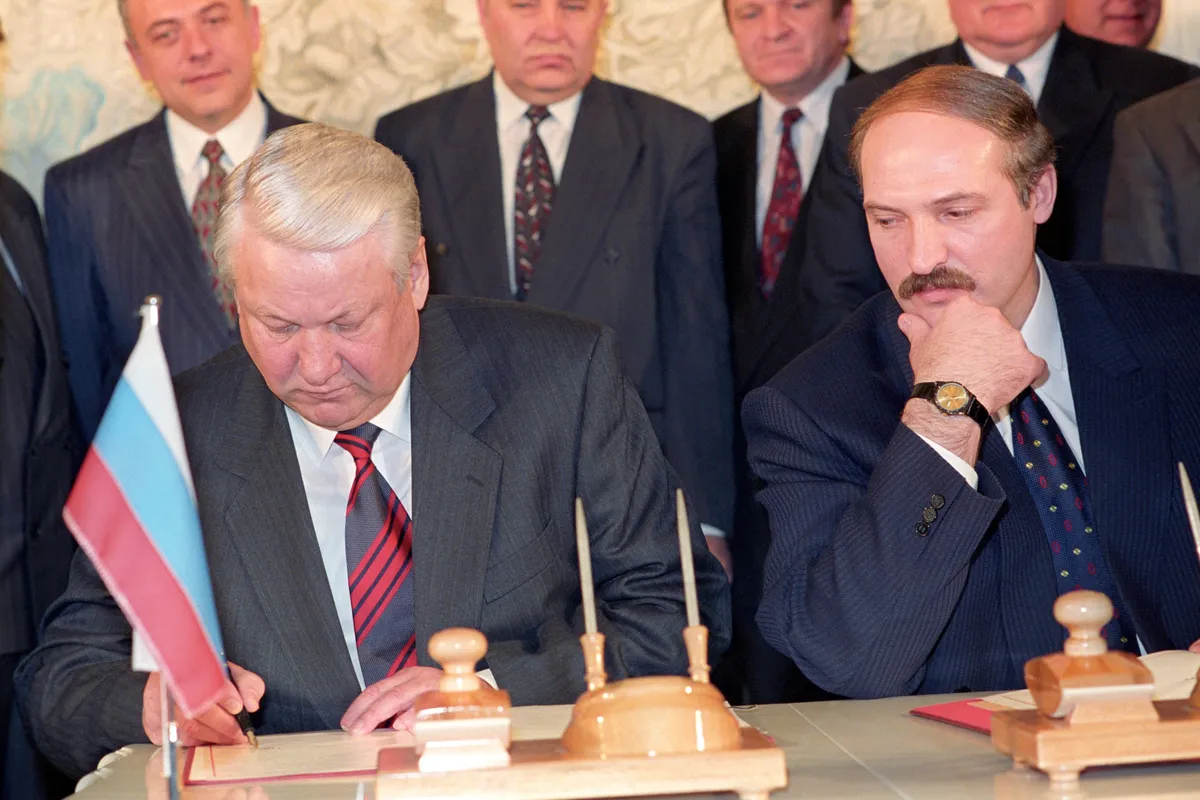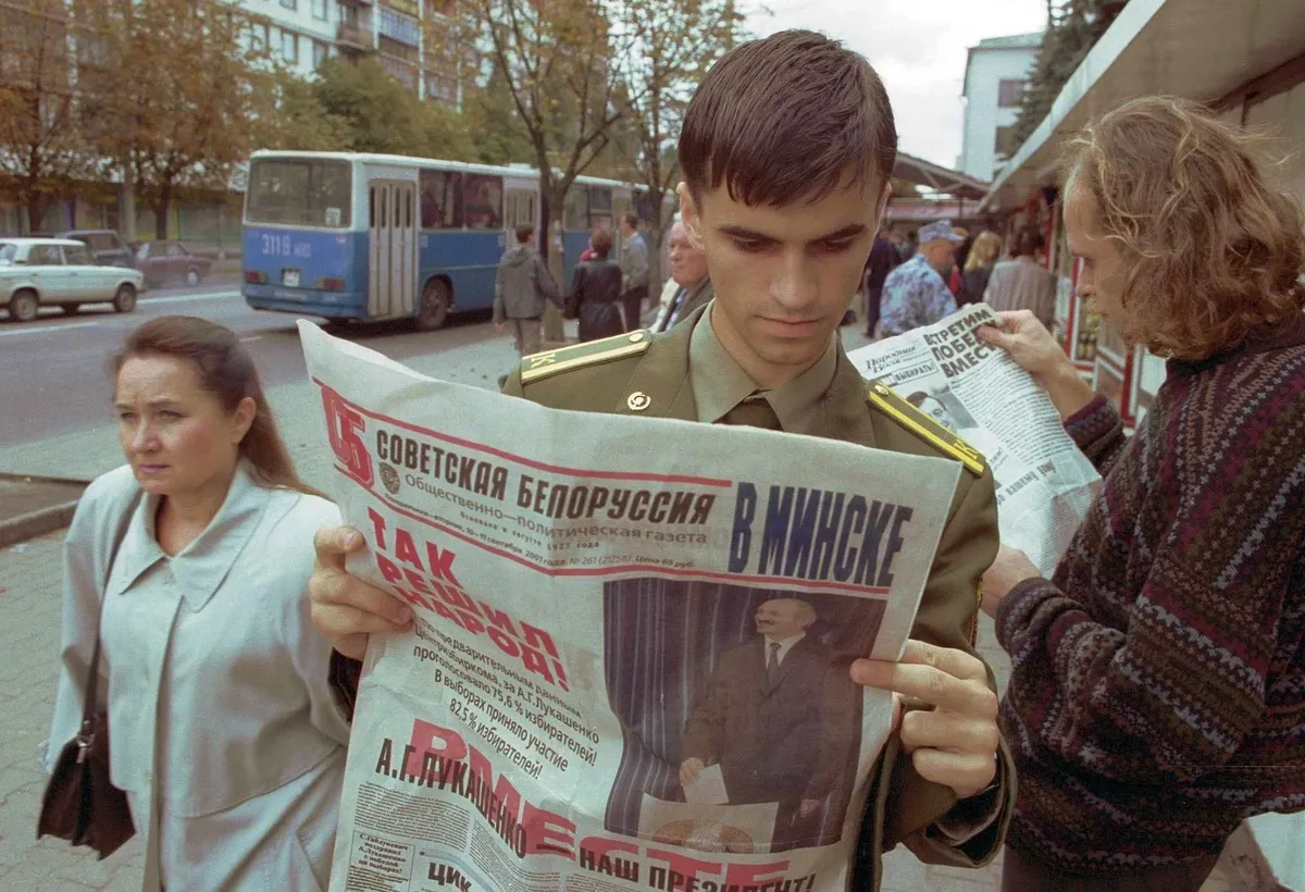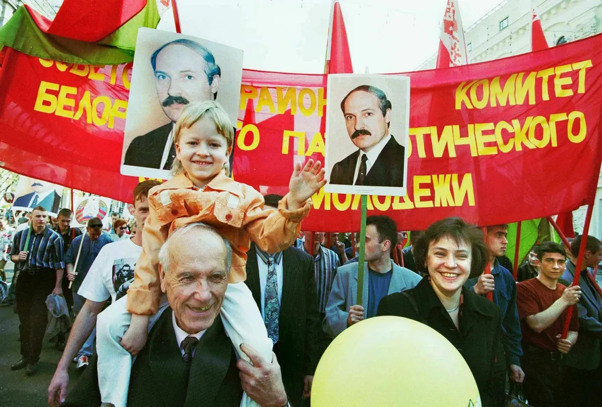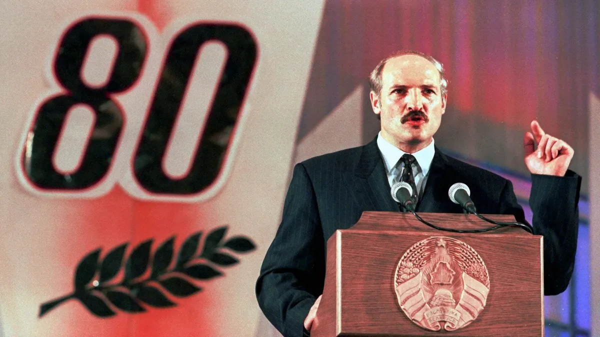 Lukashenko looks on as Russian President Boris Yeltsin signs the Contract on Friendship, Neighbourliness and Cooperation in Minsk, Belarus, 22 February 1995. EPA/VIKTOR DRACHEVMarchers in Minsk carry portraits of Lukashenko to celebrate the first anniversary of a referendum that gave him almost unlimited powers, 22 November 1997. Photo: EPA / VIKTOR DRACHEVAn elderly man carries his granddaughter on his shoulders during May Day celebrations in Minsk, 1 May 1998. Photo: EPA / VICTOR DRACHEVTwo elderly Russian women who wish Lukashenko was their president, in a Russian village close to the Belarusian border, 26 October 1998. Photo: EPA / VIKTOR DRACHEVLukashenko and Russian Prime Minister Vladimir Putin answer questions from journalists at Moscow's Vnukovo Airport, 9 December, 1999. Photo: EPA / SERGEI CHIRIKOVRussian President-elect Vladimir Putin, Alexander Lukashenko and Ukrainian President Leonid Kuchma light candles in a church in the Russian village of Prokhorovka, near the Ukraininan border to mark 55 years of peace, 3 May 2000. Photo: EPA / REUTERS POOLA military cadet in Minsk reads a newspaper following Lukashenko's election victory, 10 September 2001. Photo: EPA / VICTOR DRACHEVA jubilant Lukashenko celebrates after he and his team mates win a 4x5km relay race in an amateur cross country skiing event in Raubichi, outside Minsk, 3 February 2001. Photo: EPA PHOTO EPA / MAXIM MALINOVSKYLukashenko speaks to Russian Prime Minister Vladimir Putin in Minsk, 8 September 1999. Photo: EPA / RTR POOL / VASILY FEDOSENKOAlexander Lukashenko joins military exercises near Hrodna, Belarus ahead of presidential elections the following month, 31 August 2001. Photo: EPA / ITAR-TASSA family celebrates Lukashenko's election victory as the political opposition claims “massive fraud”, 10 September 2001. Photo: EPA / VICTOR DRACHEVUkrainian President Leonid Kuchma, Putin and Lukashenko chat during a people’s friendship festival held in the Ukrainian town of Novhorod-Siverskyi, 27 June 2004. Photo: EPA / ALEXEI PANOVVladimir Putin and Lukashenko confer in the Kremlin, 23 June 2005. Photo: EPA / IVAN SEKRETAREV/ POOLVenezuelan President Hugo Chávez welcomes Lukashenko at the Miraflores Palace in Caracas, Venezuela, 26 June 2012. Photo: EPA / David FernándezLukashenko lets his youngest son Nikolay cast his ballot for him at a polling station in Minsk during parliamentary elections in Belarus on 23 September 2012. Photo: EPA / TATYANA ZENKOVICHVladimir Putin, Alexander Lukashenko and Russian hockey player Vyacheslav Fetisov play in an ice hockey match in Sochi, Russia, on 4 January 2014. Photo: EPA / ALEXEY NIKOLSKY / RIA NOVOSTI / GOVERNMENT PRESS SERVICEFrench actor Gérard Depardieu and Alexander Lukashenko carry scythes as they walk through the grounds of the official presidential residence outside Minsk, 22 July 2015. Photo: EPA / ANDREI STASEVICHAlexander Lukashenko helps construction workers carry a log during the construction of a rhythmic gymnastics centre in Minsk, 22 April 2016. Photo: EPA / MAKSIM GUCHEK / BELTA / POOLLukashenko and Ukrainian President Petro Poroshenko review an honour guard outside the Presidential Administration building in Kyiv, Ukraine, 21 July 2017. Photo: EPA / STEPAN FRANKOSvetlana Tikhanovskaya at a rally in Minsk after she agreed to replace her husband Siarhei Tsikhanouski as the opposition candidate in the presidential election following his arrest, 19 July 2020. Photo: EPA-EFE / TATYANA ZENKOVICHProtesters in Minsk in front of riot police during an anti-Lukashenko protest after polling in the country’s 2020 presidential election ended, 9 August 2020. Photo: EPA-EFE / YAUHEN YERCHAKA vast turnout for a demonstration against police brutality and the results of the Belarusian presidential election in Minsk, 16 August 2020. Photo: EPA-EFE / YAUHEN YERCHAKA protestor injured during a demonstration against Lukashenko's projected election victory in Minsk, 9 August 2020. Photo: EPA-EFE / STRINGERThe military blocks a demonstration against the results of the presidential elections, in Minsk, Belarus, 30 August 2020. Photo: EPA-EFE / STRINGERLukashenko attempts to rally his supporters in Minsk as demonstrations against his rule grow across Belarus, 16 August 2020. Photo: EPA-EFE / YAUHEN YERCHAKAlexander Lukashenko attends a Eurasian Economic Union summit in Moscow, 8 May 2024. Photo: EPA-EFE / EVGENIA NOVOZHENINA / POOL