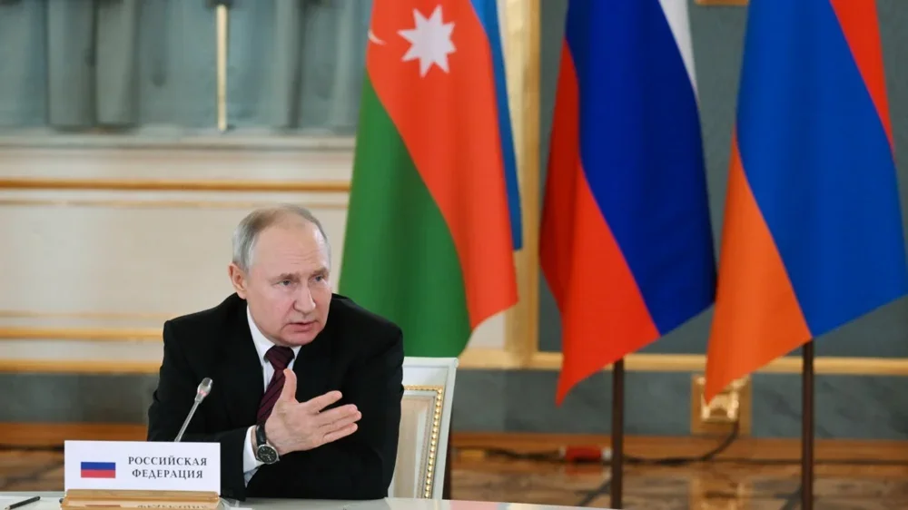 Vladimir Putin attends a trilateral meeting with Azerbaijani President Ilham Aliyev and Armenian Prime Minister Nikol Pashinyan at the Kremlin, 25 May 2023. Photo: EPA-EFE / ILYA PITALEV / SPUTNIK / KREMLIN POOL