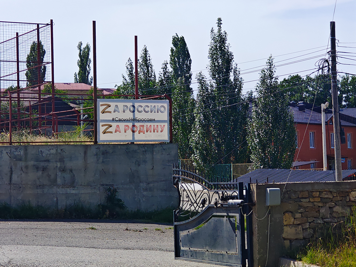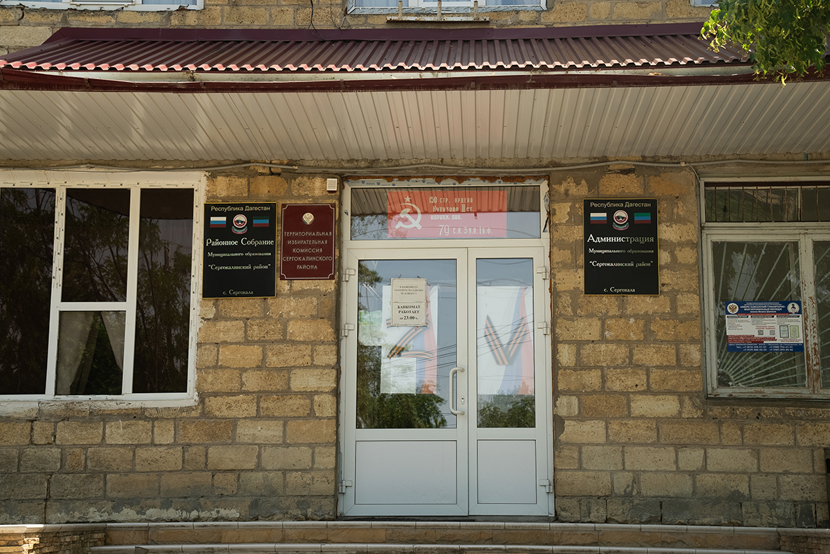 На одной двери здания районной администрации буква Z, на другой — V, сверху — копия Знамени Победы с серпом и молотом. Внутри — плакат с хадисом из сборника аль-Бухари: «Убийство одного невинного человека перед Аллахом подобно убийству всего человечества».