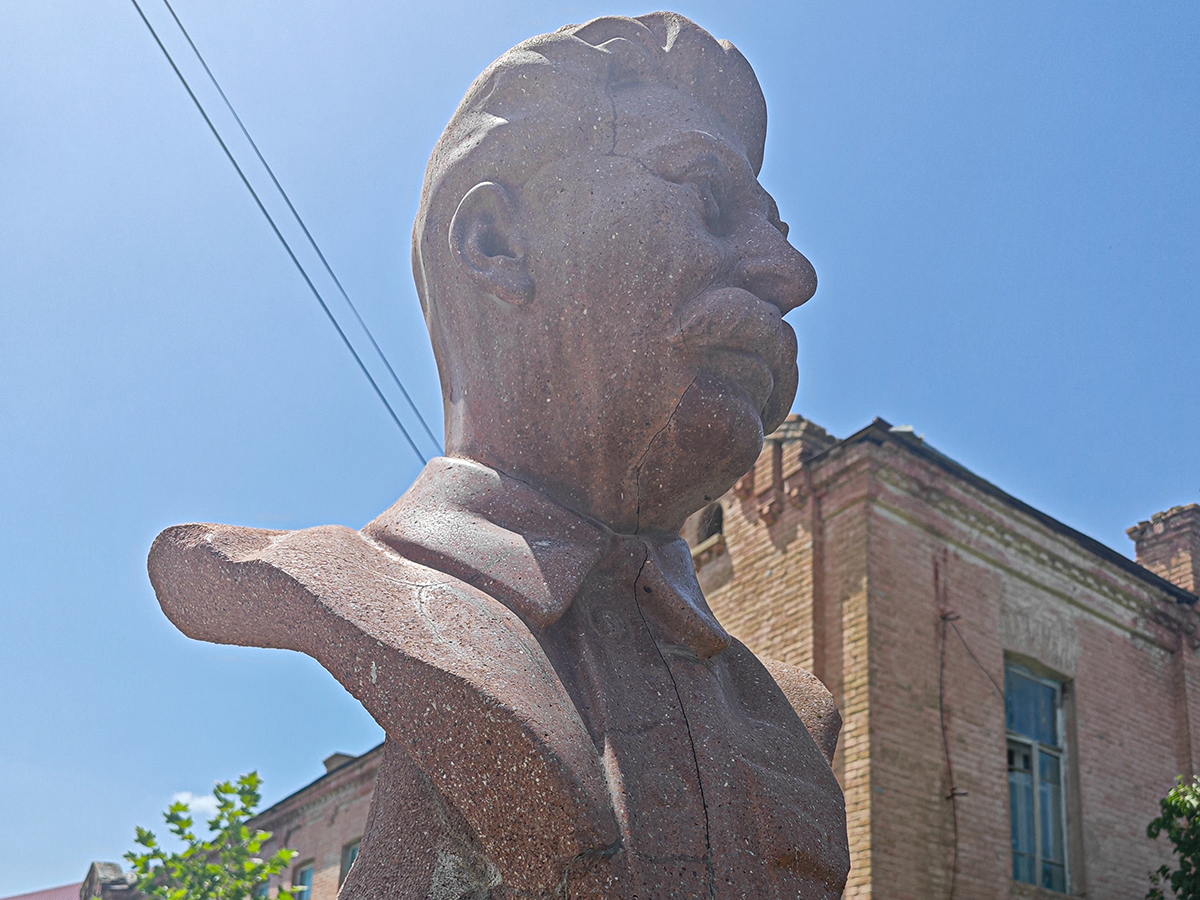 Плакат недалеко от районной администрацииФото: Владимир Севриновский для ТД Позади Нурбагандова стоят два бюста: белый Ленин и Сталин из розового гранита. Изображения усатого вождя в Дагестане давно перестали быть редкостью, но это было одним из первых. Районные коммунисты установили его в 2009 году. Памятник был в селе еще при жизни «отца народов». После развенчания культа личности его убрали, но не выбросили, а спрятали в запасниках. Решили, что когда-нибудь времена снова изменятся, и оказались правы. Гладкий, отполированный Сталин выглядит как новенький, только по лицу змеится трещина от лба до шеи.