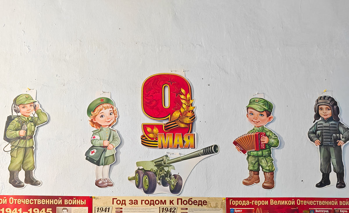 Библиотекари говорят, что часто беседуют с подростками о войне. Рядом с российским флагом висит плакат «Дети — за мир!». На стенде, посвященном Дню Победы, улыбаются мультяшные малыши: танкист, радист, медсестра и солдат с гармошкой.