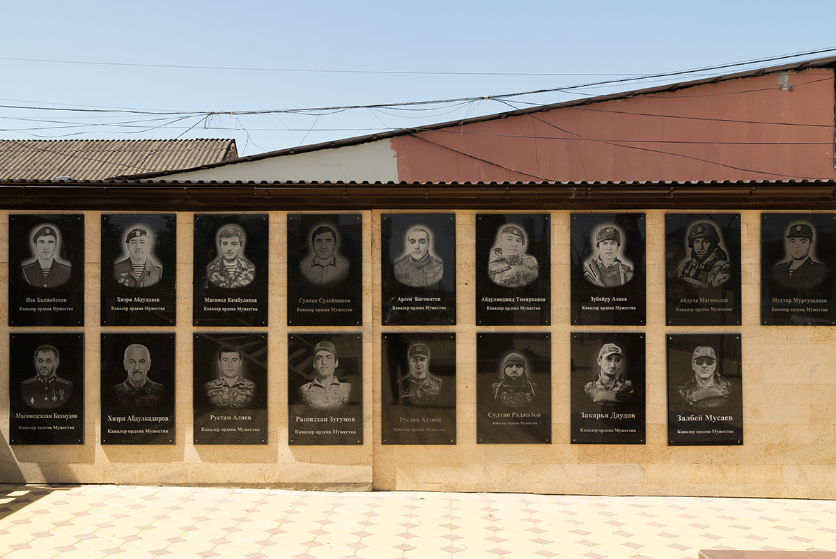 На стене в центре села висят 20 гранитных плит с портретами уроженцев района, погибших в Украине. Ни даты рождения, ни даты смерти — только имя, фамилия и лаконичная надпись «Кавалер ордена Мужества».