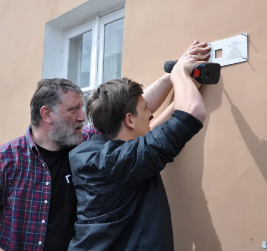 Правнуки Фридлянд прикручивали мемориальную табличку, им помогал Сергей Пархоменко*, который, собственно, 10 лет назад и придумал проект «Последний адрес».