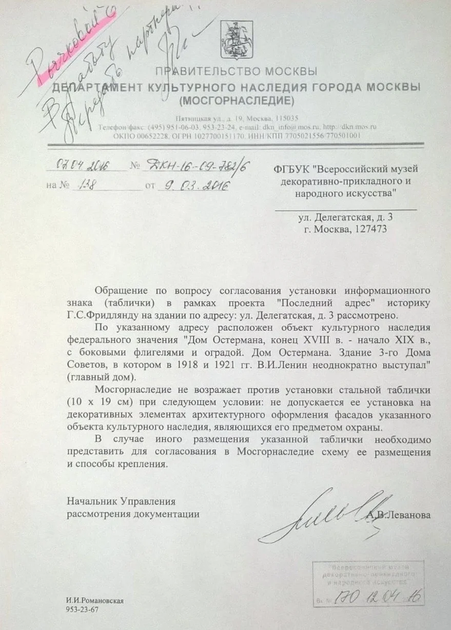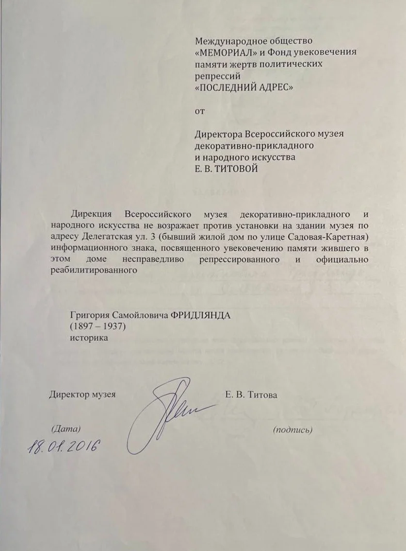 В середине апреля 2023 года ко мне обратилась Наталья Юрьевна Кайкова, заместитель директора Всероссийского музея декоративно-прикладного искусства, в тот момент она замещала директора. Кайкова сообщила, что в музей пришло письмо из Министерства культуры, срочно просили прислать документы о мемориальной табличке Григория Фридлянда.