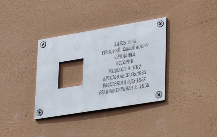 «Здесь жил Григорий Самойлович Фридлянд, историк, родился в 1897, арестован 31.05.1936, расстрелян 08.03.1937, реабилитирован в 1956».