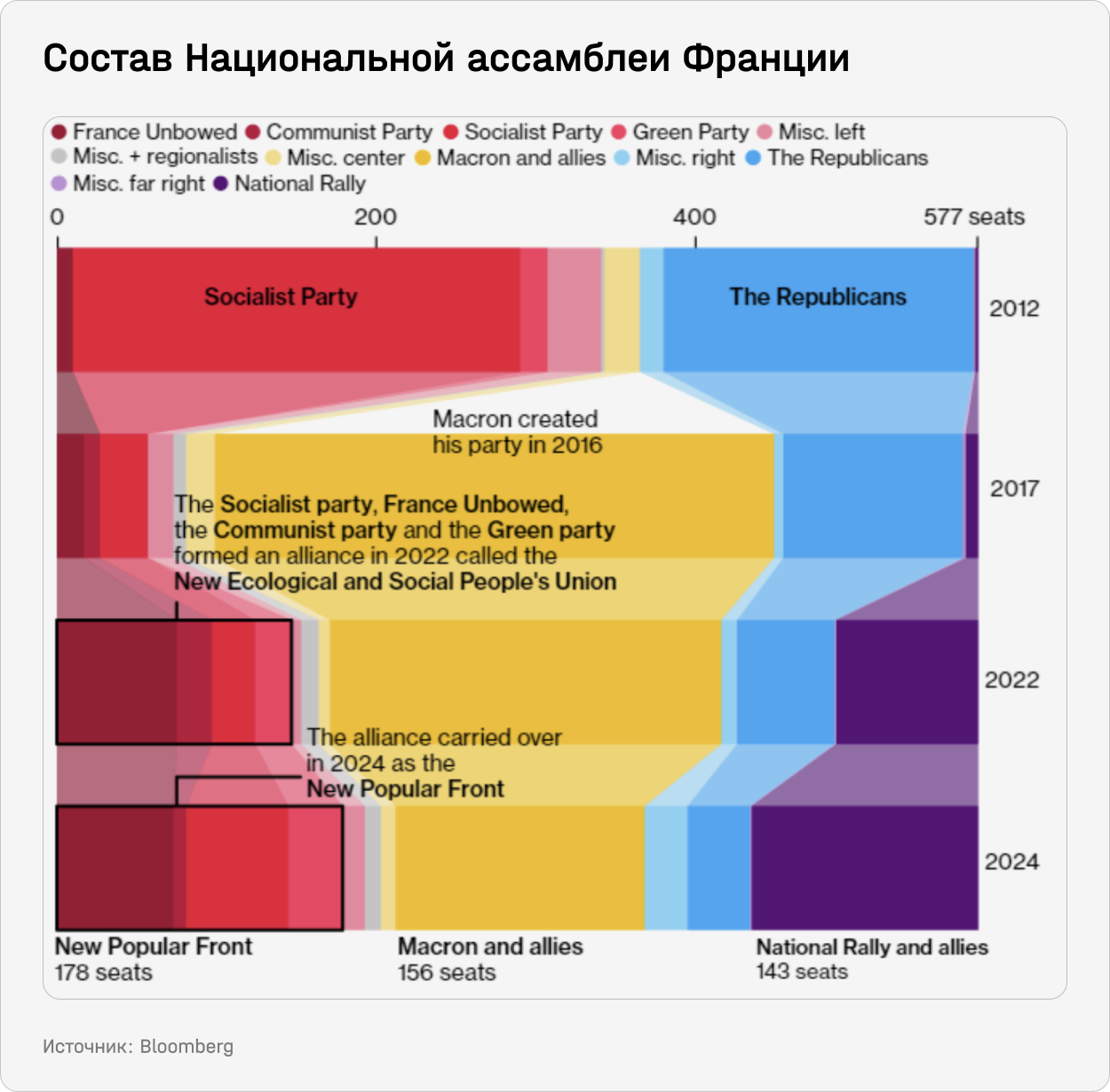 Коалиция левых и зеленых партий под названием «Новый народный фронт» во втором туре выборов во Франции неожиданно получила наибольшее количество мест (182). Более центристская коалиция «Вместе!» во главе с действующим президентом Эмманюэлем Макроном заняла второе место и получила 163 места. А бывший фаворит, крайне правая партия «Национальное объединение», которая выиграла первый тур, оказалась вытесненной на третье (143 места). Подробнее об итогах выборов мы писали тут.