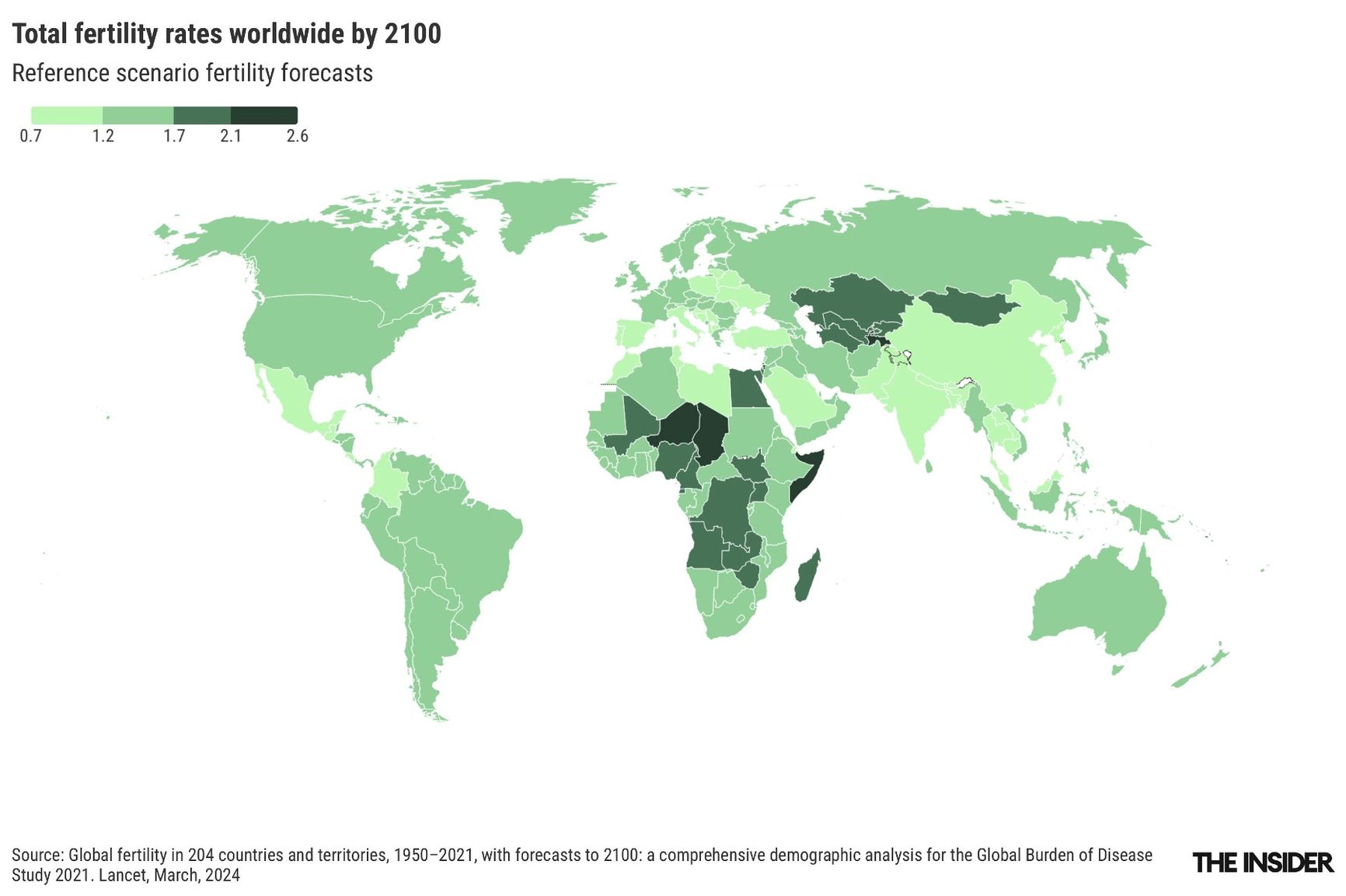 By 2050, the average global fertility rate is projected to decline to 1.8, leaving only 49 countries (24%) with fertility rates above the 2.1 replacement level. Looking ahead to 2100, these numbers are expected to further decrease — to 1.6 and 6 countries (2.9%), respectively. Although forcasts on such a time horizon are less reliable, the six states expected to be the last to join the sub-replacement group are Somalia, Niger, Chad, Tajikistan, and the two small island states Tonga and Samoa.
