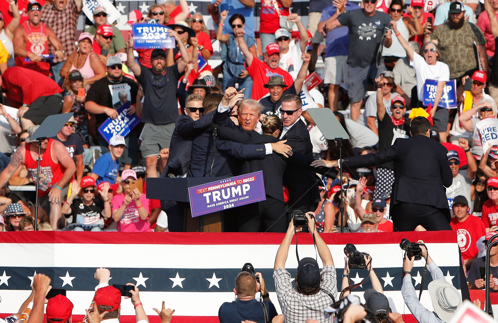 На 45-го президента США Дональда Трампа, баллотирующегося на новый срок, совершили покушение 13 июля во время митинга в городе Батлер в Пенсильвании. По версии ФБР, в него стрелял 20-летний Томас Мэттью Крукс. При нападении Трампа ранили в правое ухо. Сотрудники Секретной службы США прикрыли собой бывшего президента и увели его со сцены. Трамп шел в окружении охраны, ударяя кулаком в воздух — так он сигнализировал своим сторонникам, что с ним все в порядке. В результате покушения погиб один из зрителей митинга, двое получили ранения. Стрелка убили сотрудники Секретной службы.