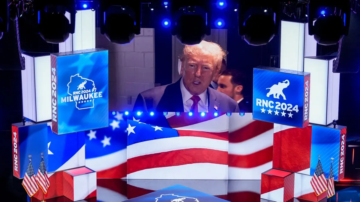 Экс-президент США, кандидат в президенты от Республиканской партии Дональд Трамп (на экране) на открытии Национального cъезда Республиканской партии, 16 июля 2024 года. Фото: AP / TASS