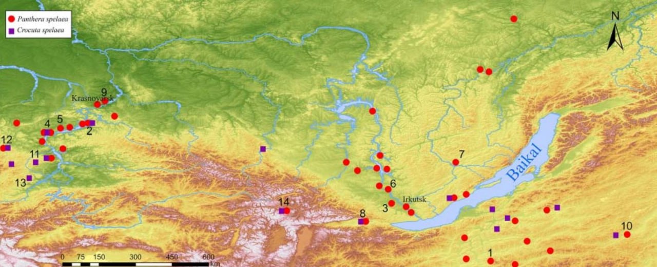 "Анализ геоточек, где нашли останки пещерного льва (Panthera spelaea) и пещерной гиены (Crocuta spelaea) в Байкало-Енисейской Сибири, показал, что эти виды обитали в разных ландшафтах. Пещерный лев, как правило, населял равнины и речные долины, тогда как пещерная гиена обитала в предгорьях. Пещерные гиены были особенно многочисленны в начале каргинского интерстадиала и сохранялись до каргинско-сартанской границы. Пещерные львы имели более широкое хронологическое распространение