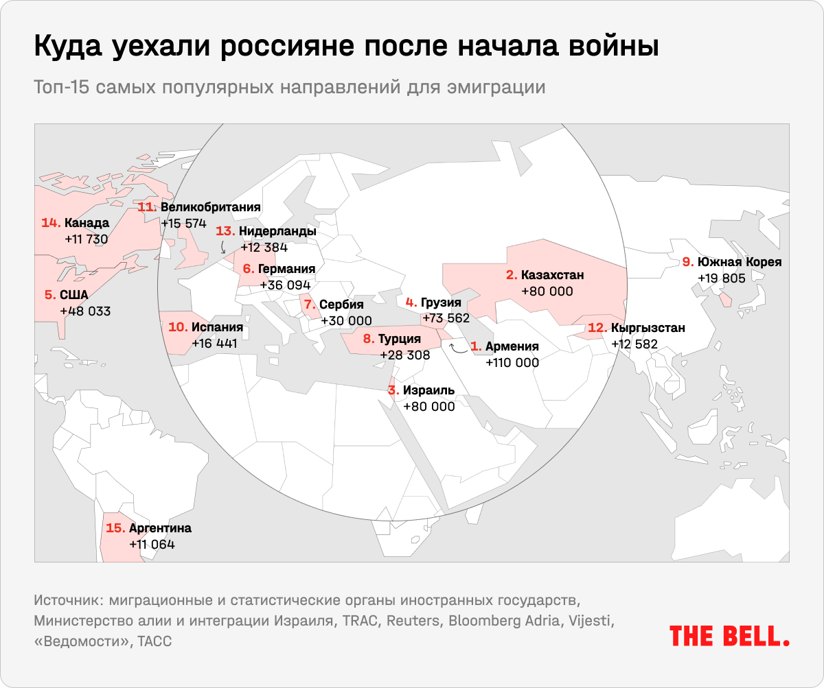 И к вопросу об эмиграции из России. Нас давно расстраивало отсутствие в открытых источниках достоверной статистики о размере нынешней волны. В какой-то момент мы поняли, что мы должны попробовать посчитать ее сами. Чтобы получить не приблизительные оценки, а относительно надежные цифры, мы подошли к вопросу тщательно и обратились в статистические и миграционные органы около 70 стран, в которых есть российская антивоенная эмиграция. На основе этих данных получилось, что с начала 2022 года из России уехало около 650 тысяч человек — на 150 тысяч больше приблизительных оценок, которые мы делали в конце 2022 года.