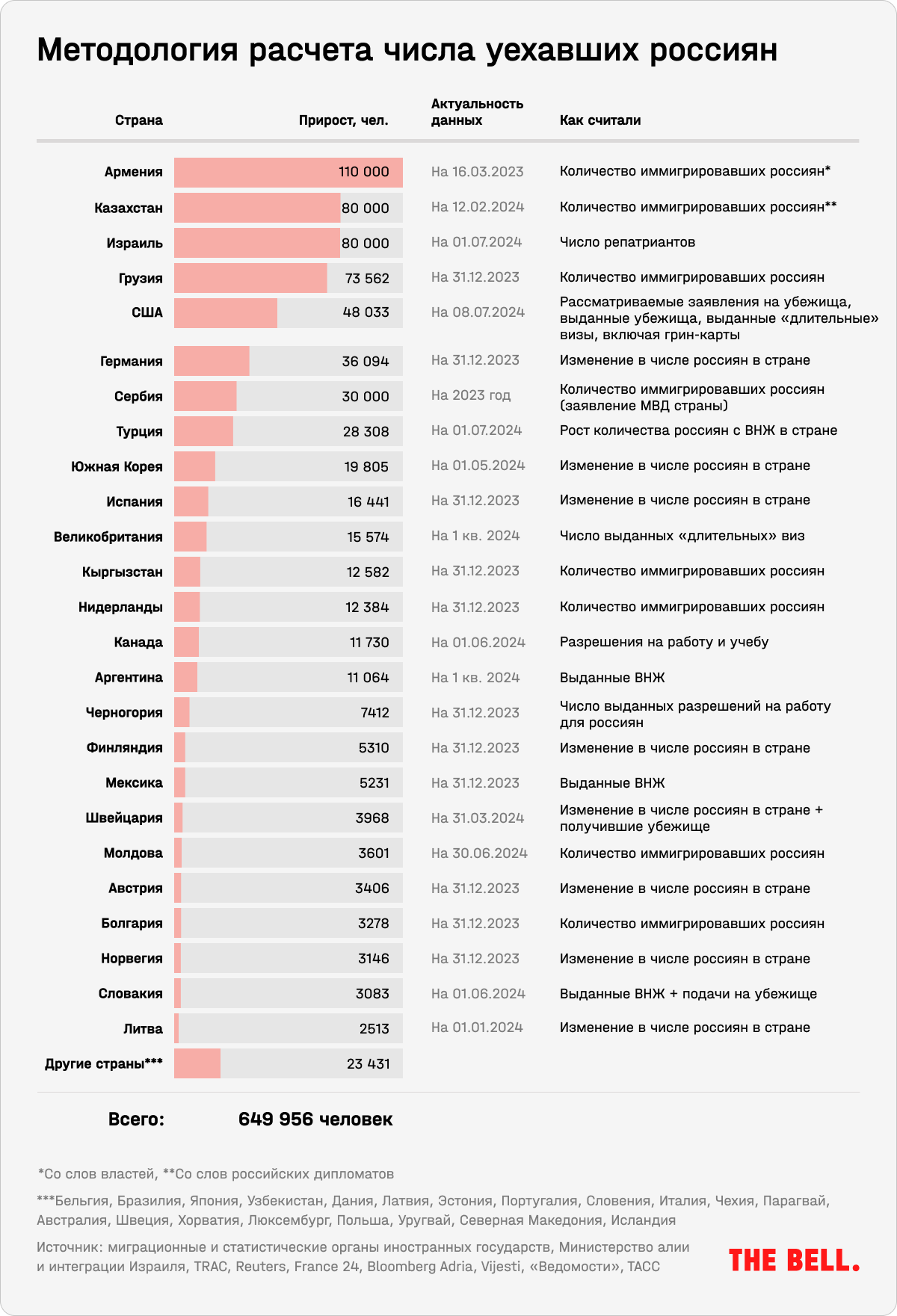 The Bell запросил информацию о россиянах в миграционных и статистических органах почти 70 стран. Кроме цифр из ответов мы использовали официальную статистику и заявления чиновников и дипломатов. Во многих случаях цифры за 2023 год, когда эмиграция еще продолжалась, были опубликованы только в этом году.