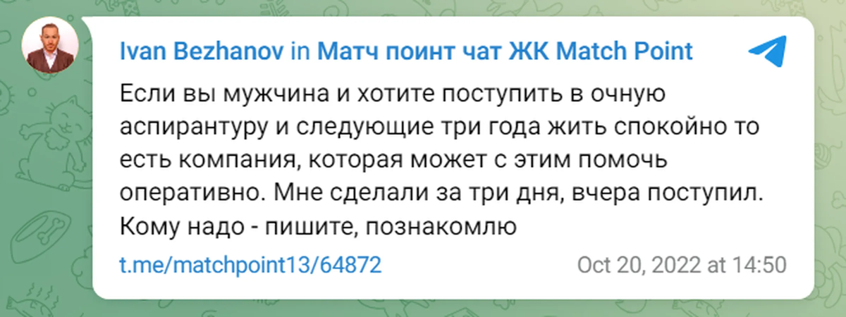 Although Bezhanov himself decided to make money from the war by supplying weapons to the front, he preferred to protect himself from mobilization. In October 2022, he himself admitted in an open chat in Telegram that he made a fake enrollment in graduate school in order to “live peacefully for the next three years.” In the message, he does not mention the university, but talks about a certain company “that can help with this quickly." He was “deferred from mobilization in three days.”