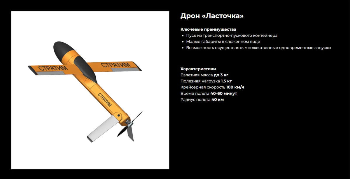 In his CV, he states that he copied the ALTIUS-600 drones that the US provided to Ukraine. These drones can be used both for reconnaissance purposes and carry a combat unit, flying over 400 kilometers. On the Stratim website, one can find the Lastochka drone, which outwardly resembles the ALTIUS-600. However, in terms of its characteristics, it is behind the American competitor.