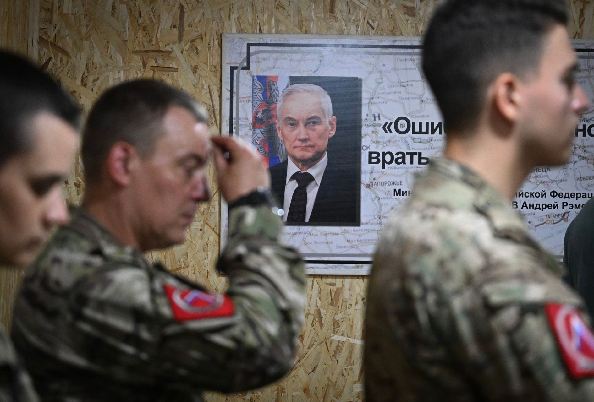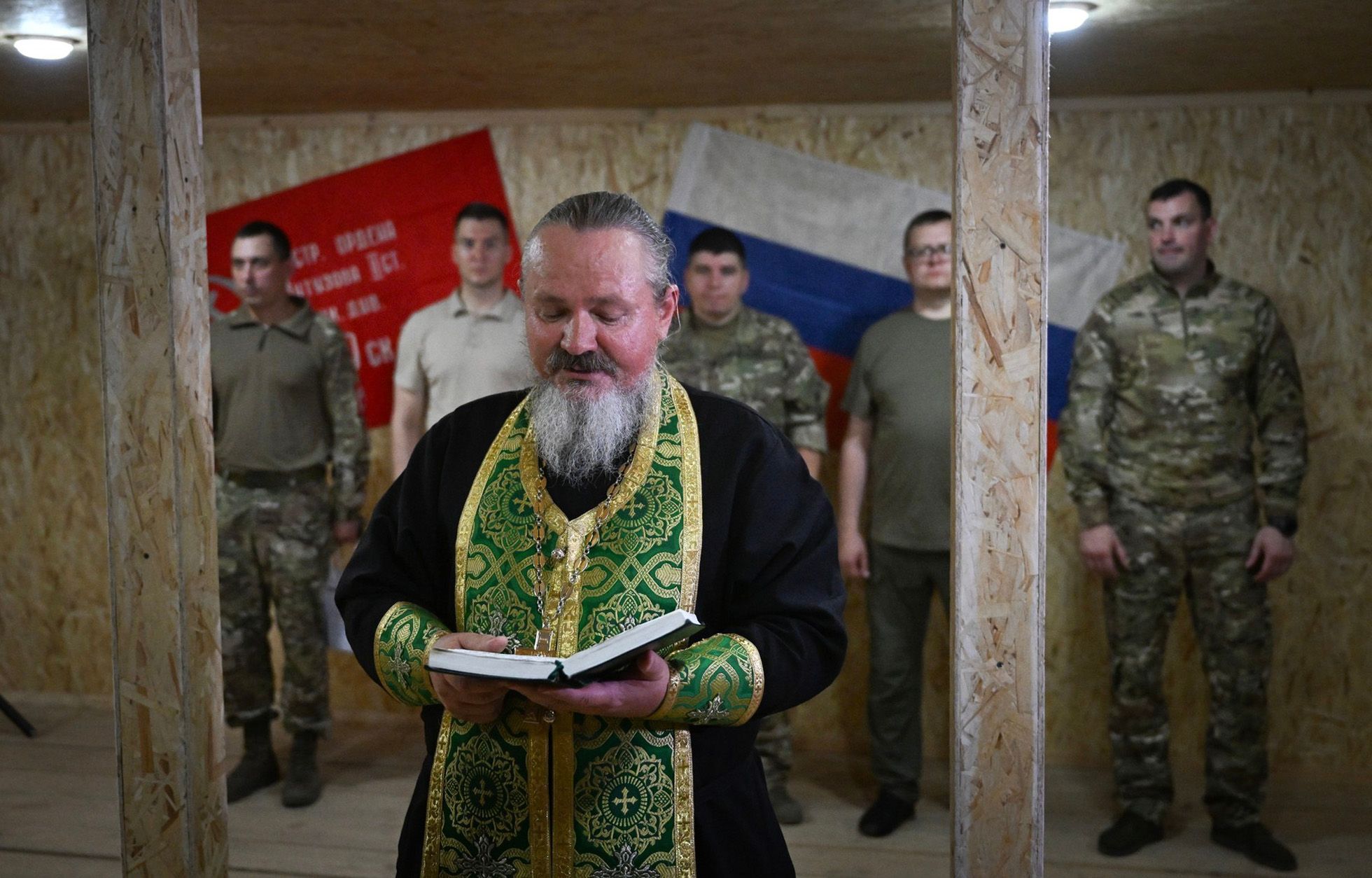 В церемонии участвовал священник. С плаката на стене на военных смотрел Белоусов. Фотографии