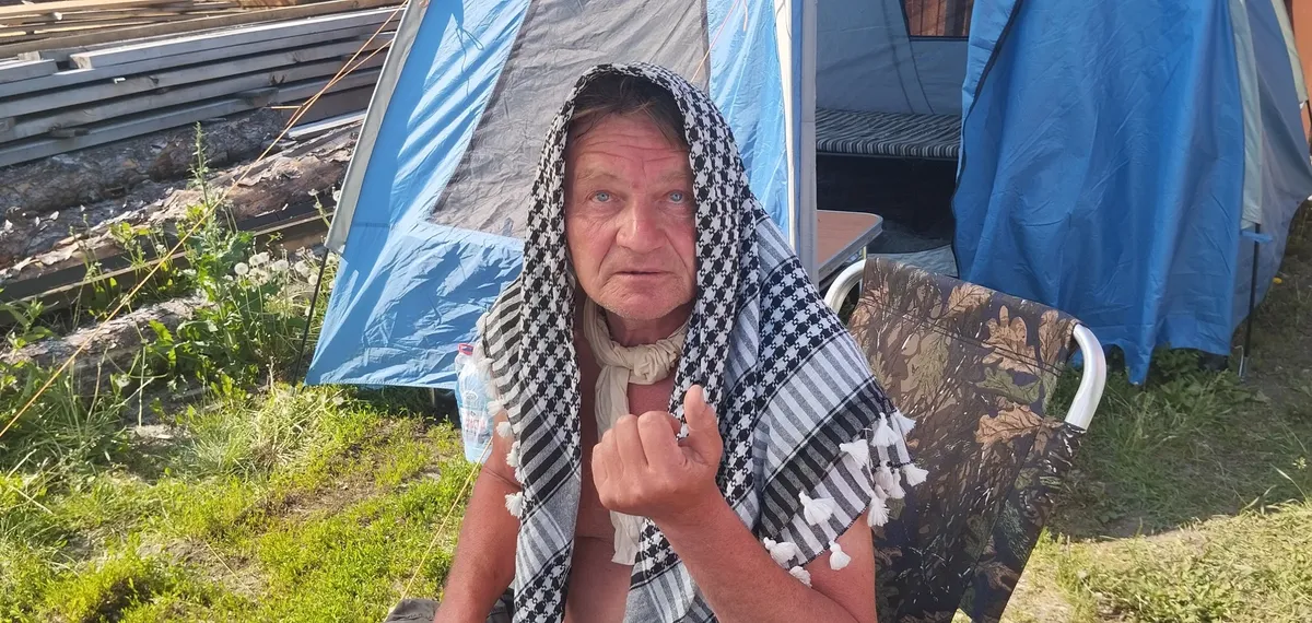 К моменту моего визита в переулке у дома Алексея, куда он и был сослан сотрудниками полиции, скопилось несколько автомобилей и около двух десятков его сторонников. Серьезное по нынешним временам количество протестующих, даже для райцентра. А для сельской местности — и вовсе что-то невиданное. Недостроенный сруб, едва покрытый крышей, украшен красными перетяжками с лозунгами: «Мы голодаем сейчас, чтобы вы не голодали завтра», «Нет строительству мусорного полигона».Под зонтом небольшой столик и синяя палатка у ворот. На ее пороге сидит мужчина с арафаткой на голове. Это и есть Алексей. Время от времени к его «офису» под зонтиком подходят жертвователи. Оставляют сигареты, спички и воду. Очень много воды.