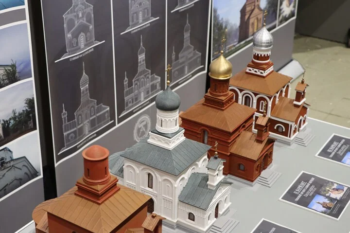 Выставка со звучным названием «С нами Бог!» воспроизводит сразу несколько архетипов, ярко и наглядно характеризующих образный строй, в котором нам, очевидно, придется жить еще долго. Она вобрала в себя две главы: первая — это галерея бюстов участников СВО, своего рода пластилиновая аллея славы (потом бюсты планируют отлить в бронзе), выполненная скульптором Еленой Брусенцовой. Вторая, более утопическая и фантазийная, включила в себя проекты реконструкции храмов, которые были разрушены на Донбассе. В основном, все они выполнены в традиции русского деревянного храмового зодчества.