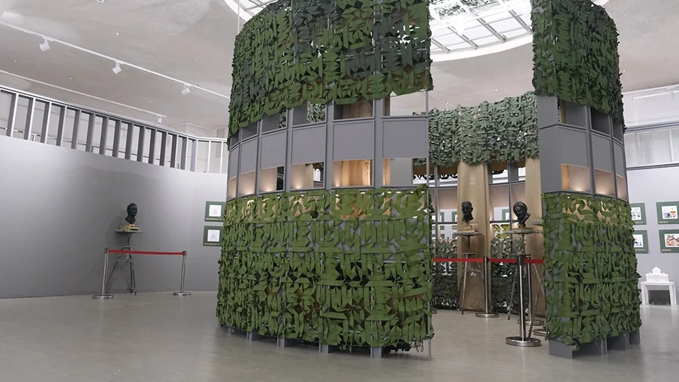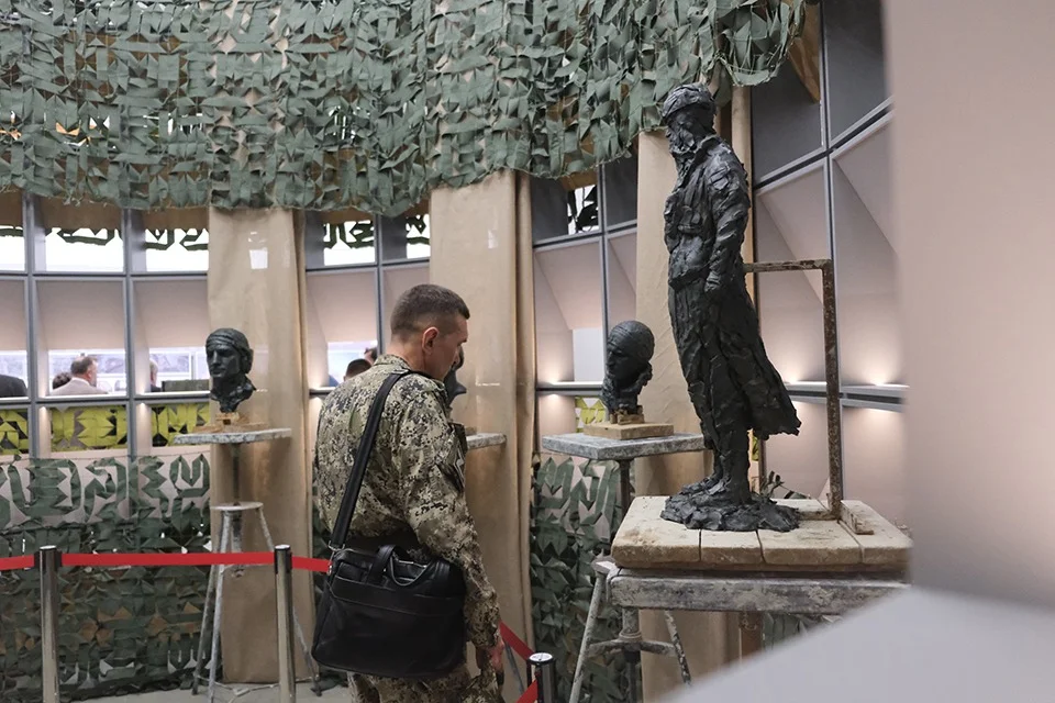 Елена Брусенцова — ученица Александра Рукавишникова, автора памятников Александру II и Михаилу Шолохову в Москве, с внятной и прямолинейной академической карьерой. Она преподаватель МАРХИ; ее скульптуру «Ожидание» 2007 года, которая представляет собой прильнувшую к забору старушку, можно увидеть в Парке «Музеон». Та же склонность к сентиментальным сюжетам и образу «своего парня», человека из народа и подобным архетипам прослеживается и на выставке про СВО. На открытии скульптуры она рассказывала, как просила участников боевых действий присылать ей фотографии тех, кого они считают героями, необязательно людей известных и наделенных властью. Экспозиционное решение тоже заслуживает внимания: бюсты выставлены в полукруглой конструкции, напоминающей часовню из маскировочной сетки. В центре нее красуется священник в бронежилете — он попал на все фотографии и афиши выставки.