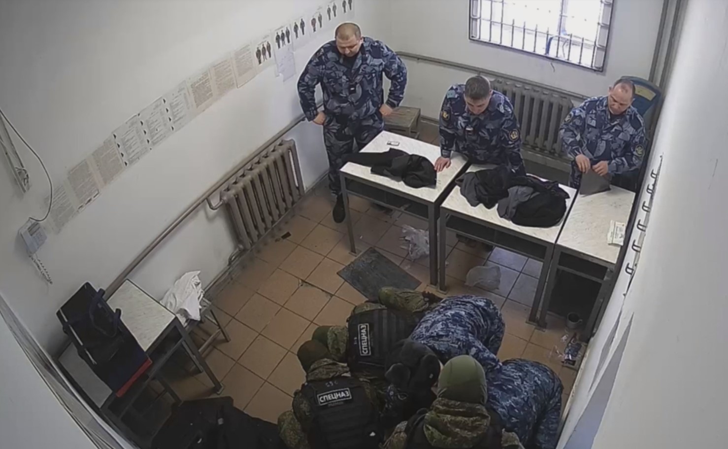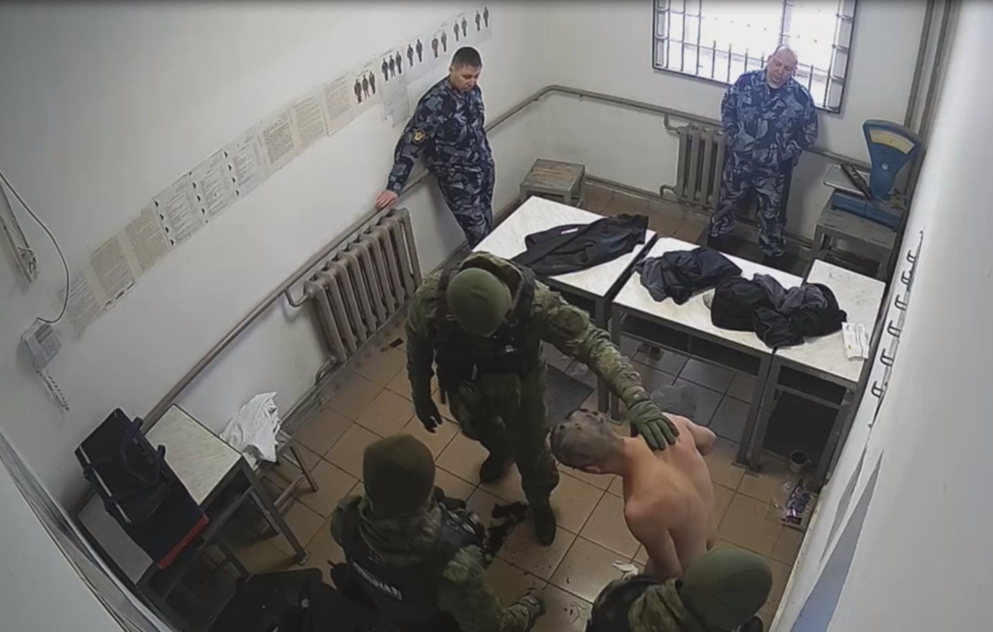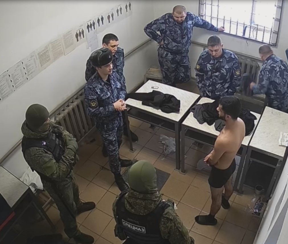 На видео в помещении с решеткой на окне пятеро мужчин в форме сотрудников ФСИН и трое спецназовцев в балаклавах проводят досмотр личных вещей и одежды заключенного. Он добровольно раздевается до трусов, затем силовики валят его и на какое-то время прижимают к полу. Потом силовики расступаются и позволяют встать. Человек уже абсолютно нагой, без бороды, усов и трусов, а на небрежно обритой голове торчат местами клочки волос.