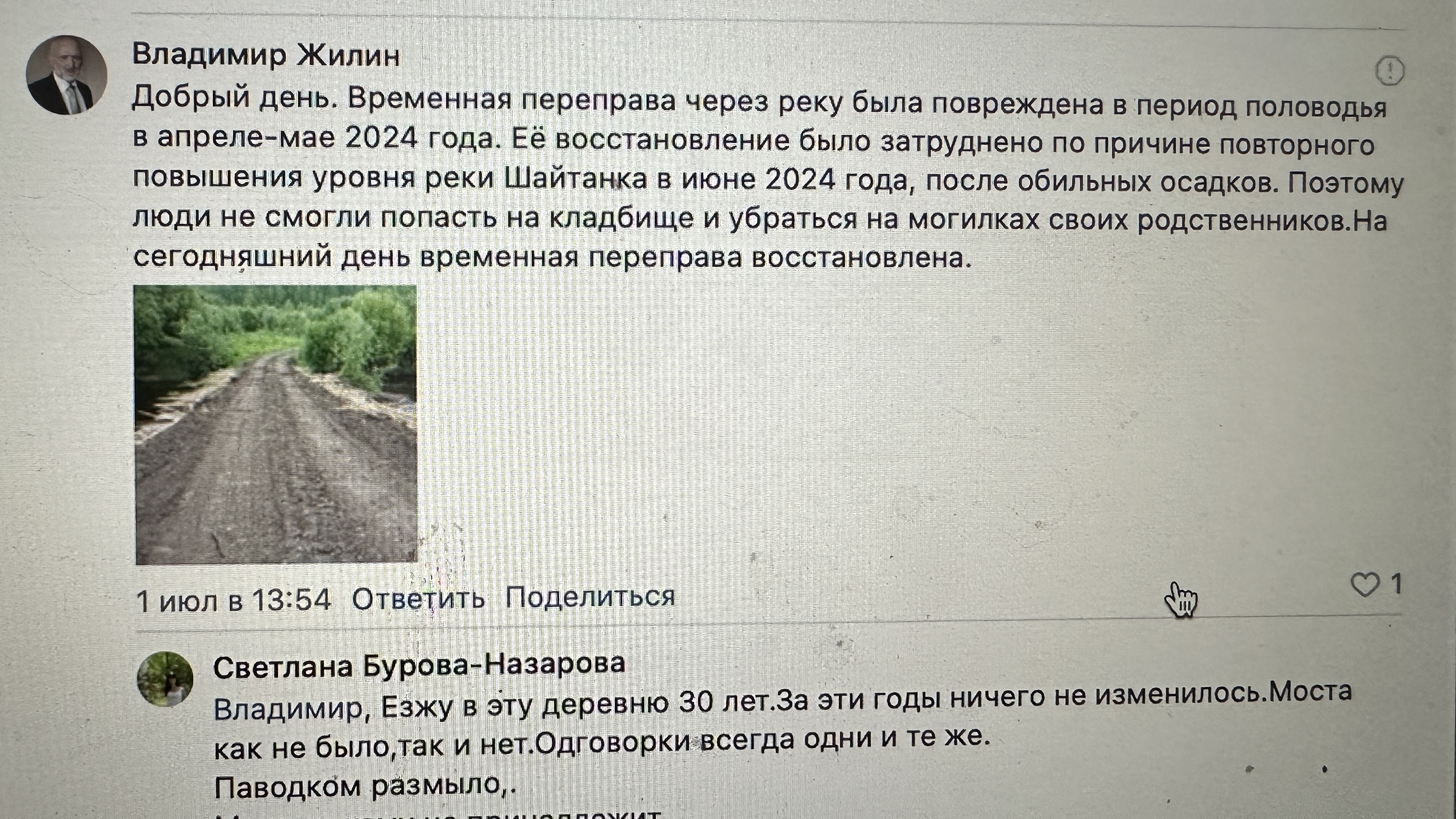 "В деревню ездим только на кладбище. В этом году проехали 320 км., а на кладбище так и не попали, не на Родительский день, не на Троицу. И ещё – моста нет давно, и эта весна не причём. Мы прошлым летом приезжали, лезли по брёвнам, чтобы попасть на кладбище. Детей пришлось оставить на берегу. Зато в районе свои деляны. Лес валят и продают", – пишет в соцсетях Светлана Бурова. – Владимир (Жилин. – Прим. ред.), вам не стыдно говорить, что переправа восстановлена? Это времянка. Построили её местные жители села для себя. Пока перевозят дрова. Ваш Волох воспользовался ситуацией, приехал только сфотографировать, чтобы людям глаза замазать. Бессовестные... Что будет с этой переправой через 1-2 месяца? Вы пишите, что мост будет восстановлен в 2025 году. А вы прикажите людям чтобы не умирали, вы же глава. Вас никто не просит строить мост за 6000000, самый обычный, чтобы люди могли пройти и катафалк проехать".