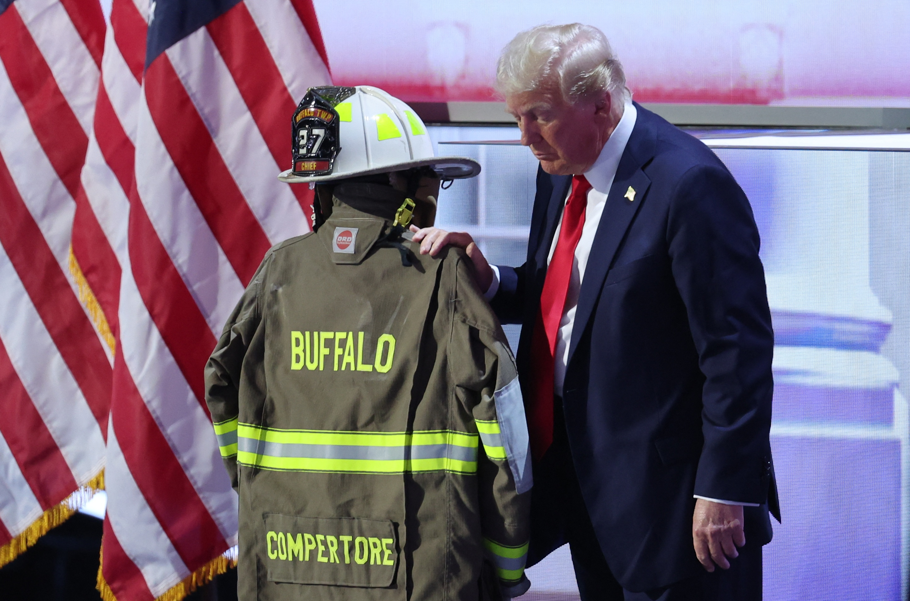 Первые полчаса речи Трамп был именно таким: он рассказал о пережитом им покушении, выглядел очень человечным, объединенным любовью с залом, которому сказал, что не был бы на сцене, если бы не божья милость. Неловкий поцелуй шлема убитого на митинге пожарного (его форма была выставлена в глубине сцены) многие нашли трогательным. Трамп пообещал быть президентом для всей Америки, “а не половины”, и заявил: “Мы все сограждане, одна нация”, и выступил против “демонизирования политических разногласий”.