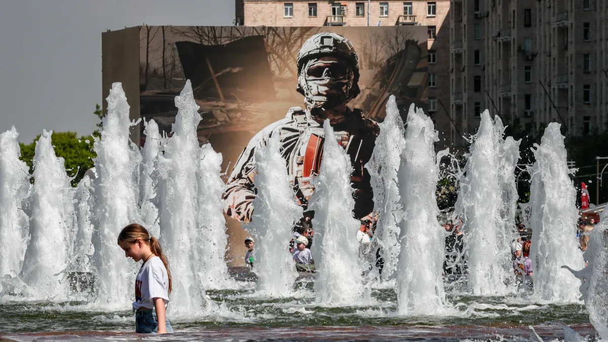 A young Russian cools down in a Moscow water fountain in front of a poster depicting a Russian soldier, 29 May 2024. Photo: Yuri Kochetkov / EPA-EFE