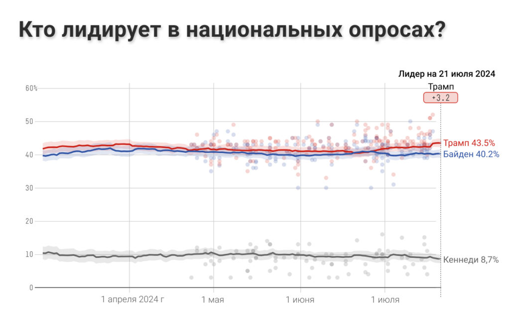 До дебатов с Трампом Байден несильно отставал от него: разрыв был в 1-3 процентных пункта, однако после дебатов и после покушения на Трампа разрыв заметно увеличился и теперь составляет примерно 6 процентных пунктов.