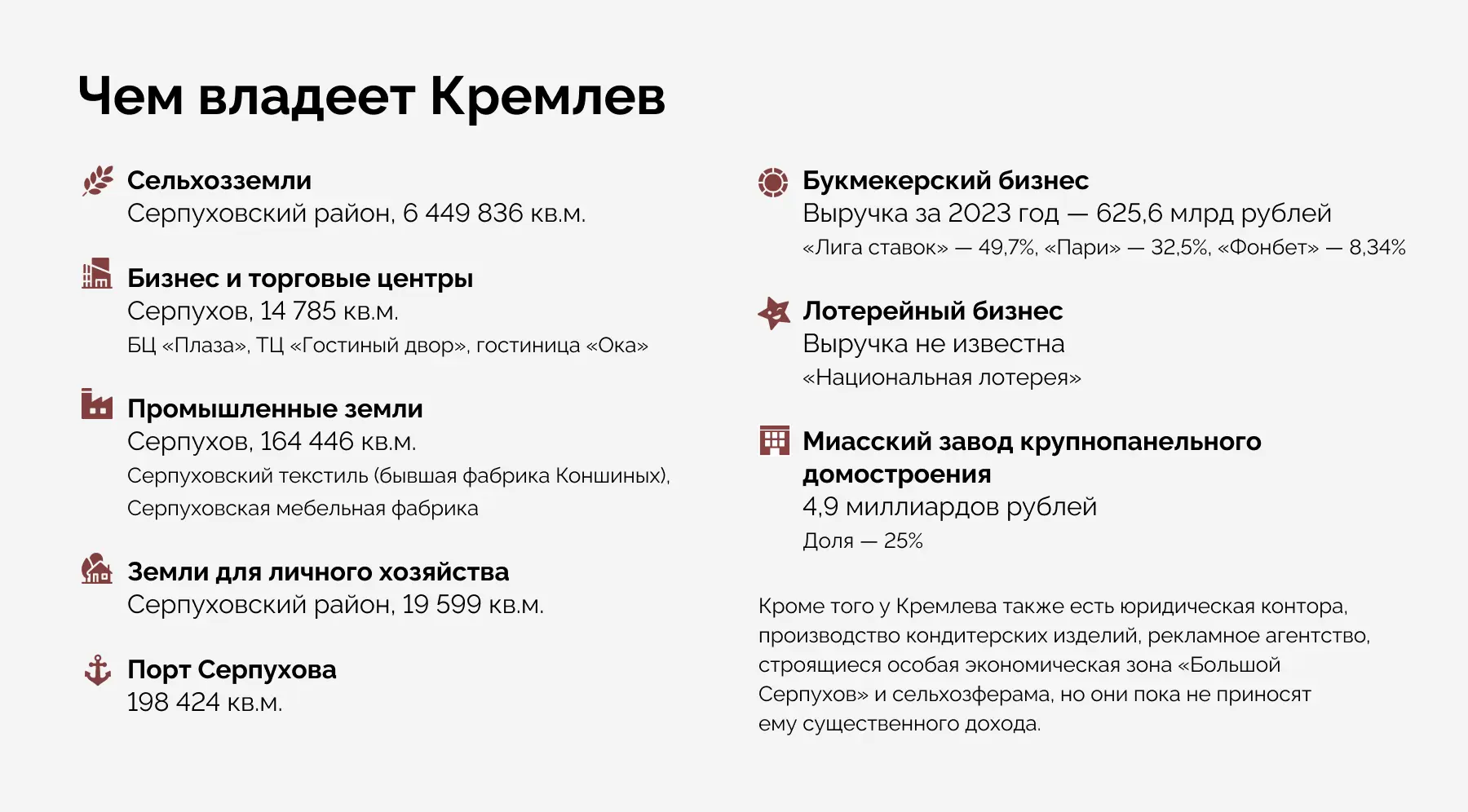 В Подмосковье Кремлеву отходят все новые объекты и компании. Например, ему перешли активы, связанные с экс-главой Серпуховского района Александром Шестуном . Речь идет о парк-отеле «Дракино», магазинах и складах ×