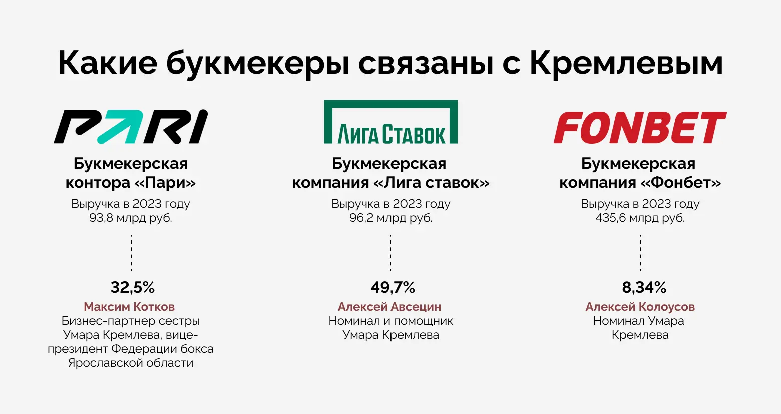 Как установил «Проект», Кремлев через доверенных лиц одновременно стал бенефициаром еще и трех ведущих букмекерских компаний России. Речь о брендах «Фонбет», «Пари» и «Лига ставок», в которые люди Кремлева вошли в течение 2022−2023 годов . Первые две перешли к людям Умара Кремлева от Александра Удодова, бывшего (возможно, фиктивно бывшего) зятя премьер-министра Михаила Мишустина. В букмекерской компании «Лига ставок» номинал Кремлева Алексей Авсецин получил долю Магомеда Гаджиева и его тестя Игоря Авдеева ×